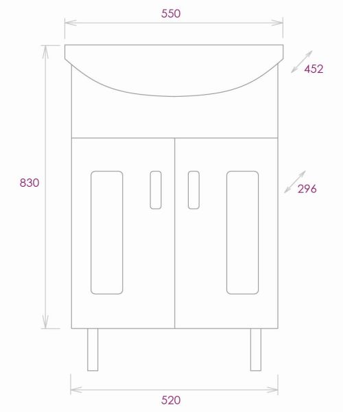 Размеры тумбы без учета раковины и ножек: 52x30x68 см.