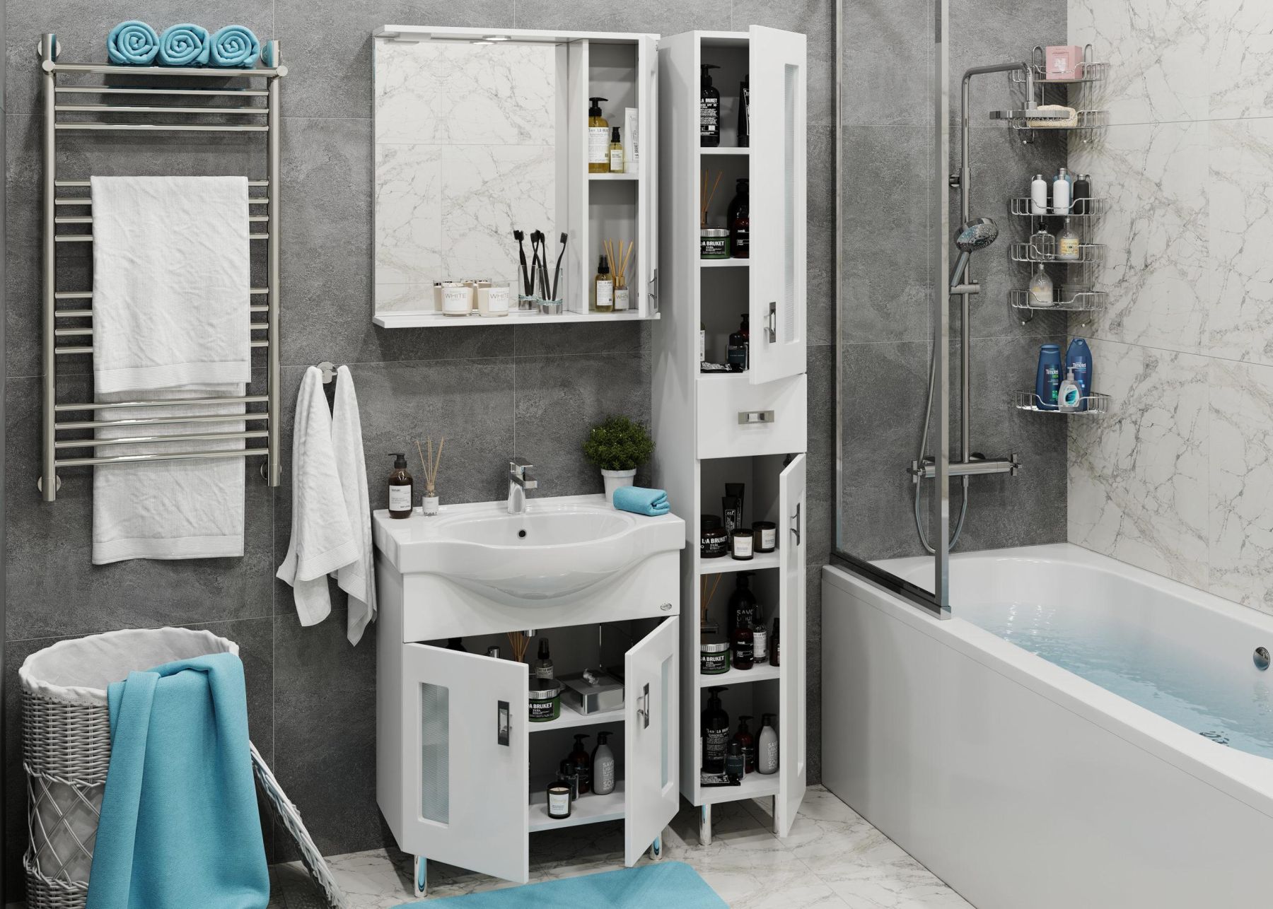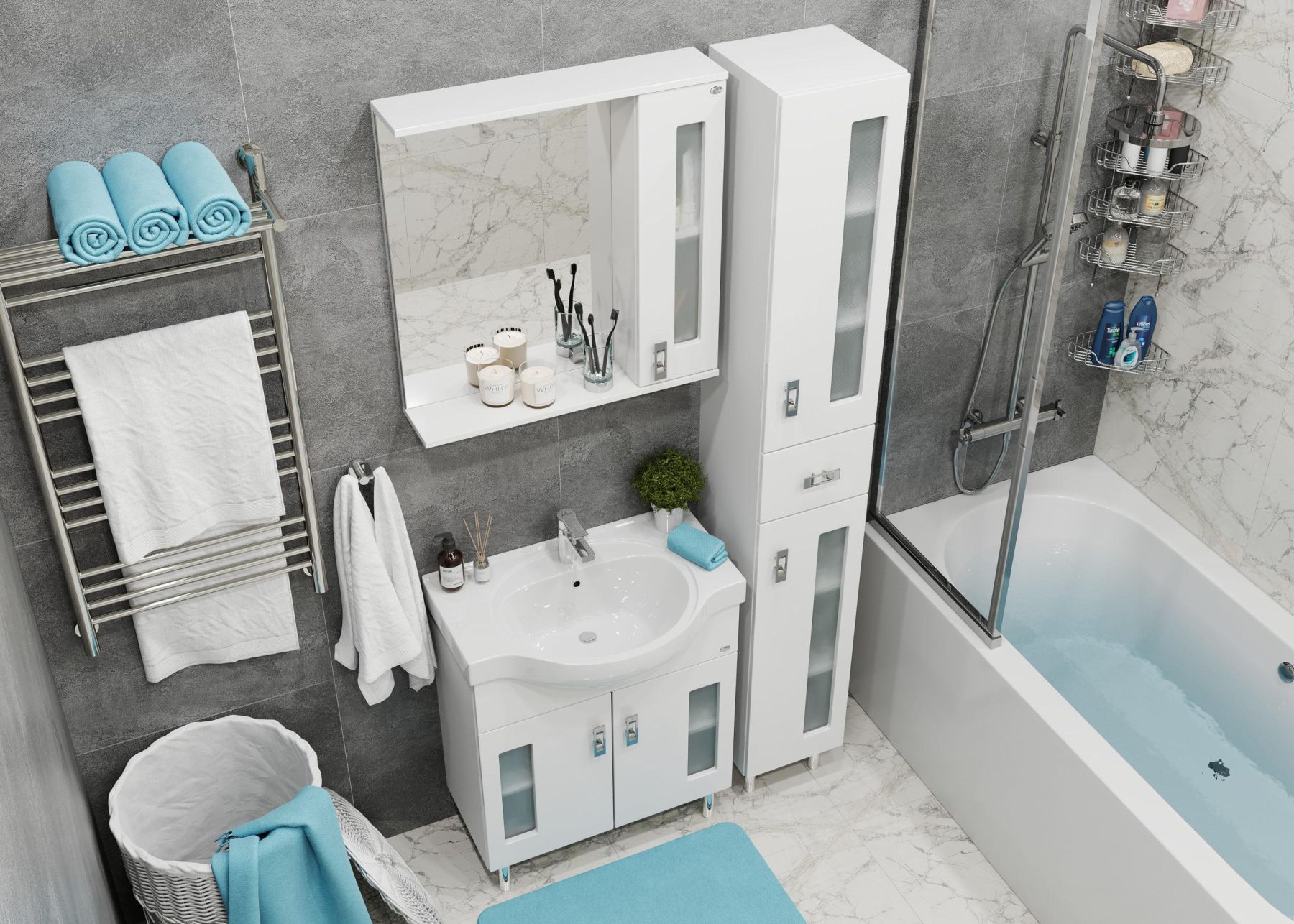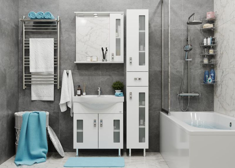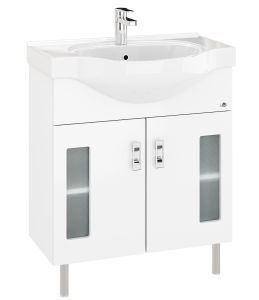 Белоснежный глянцевый цвет фасада в сочетании со вставками из матового стекла и хромированными ручками необычной формы придадут ванной комнате ощущение свежести, чистоты и уюта.