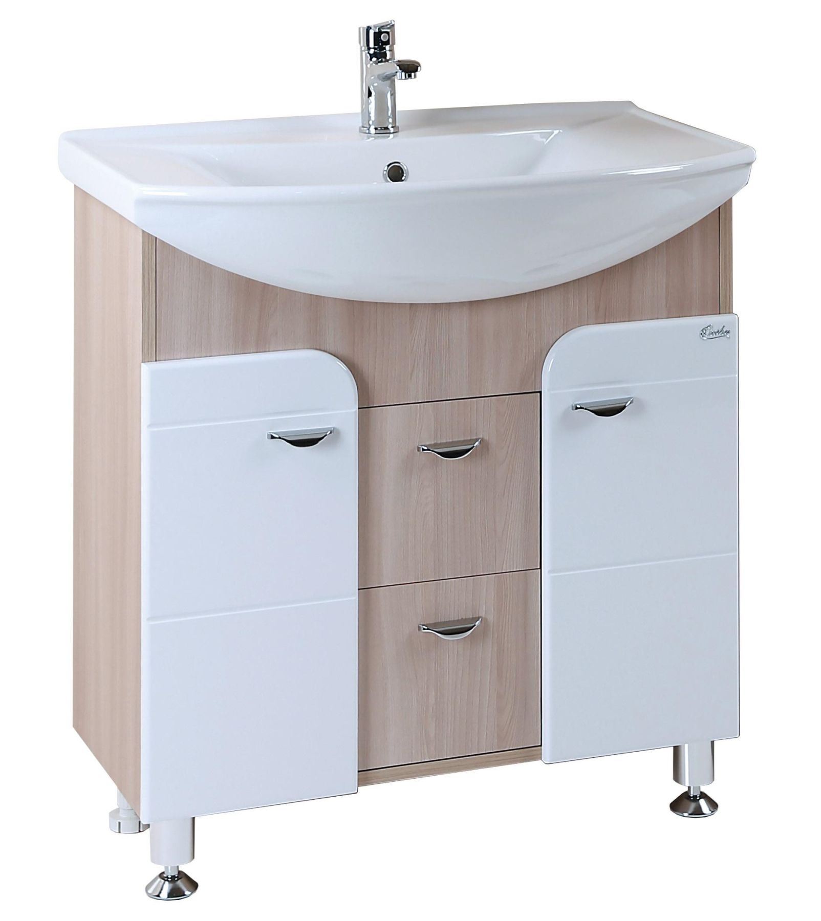 В оригинальной напольной тумбе Onika Стиль 75 удачно сочетаются контрастные цвета и фактуры: белый глянец на фоне светлого натурального дерева очень эффектно смотрится практически в любых интерьерах ванной комнаты.