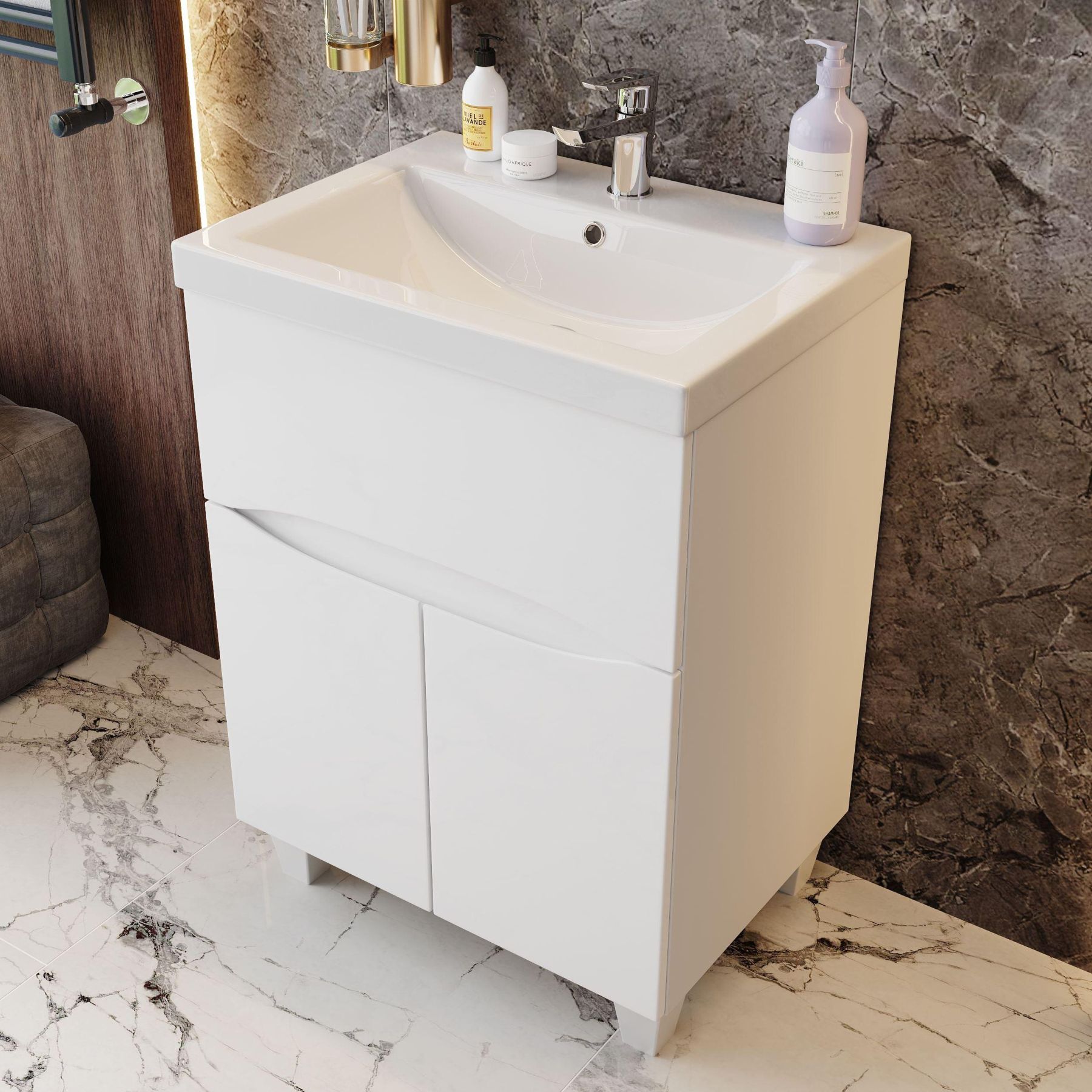 Ящик тумбы сконструирован с разделением внутреннего и подсифонного пространства и оснащен направляющими с доводчиками, а дверцы снабжены системой плавного закрывания.