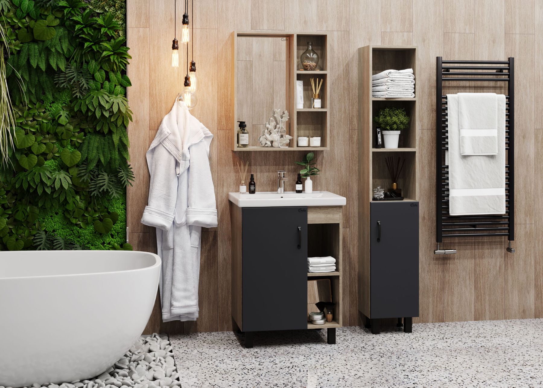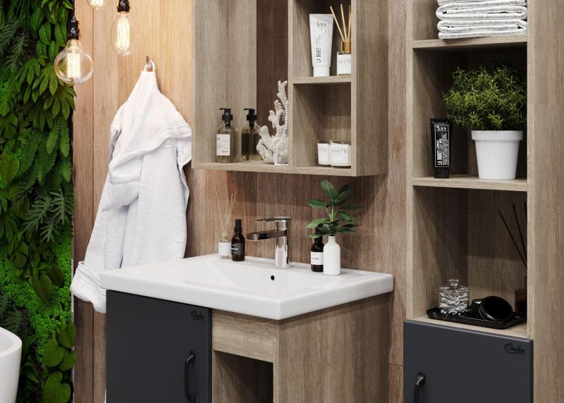 В тумбе Onika Тимбер 60 удачно сочетаются контрастные цвета и фактуры: серый матовый фасад с покрытием SoftTouch, корпус цвета дуба с роскошной текстурой, черная матовая металлическая фурнитура.