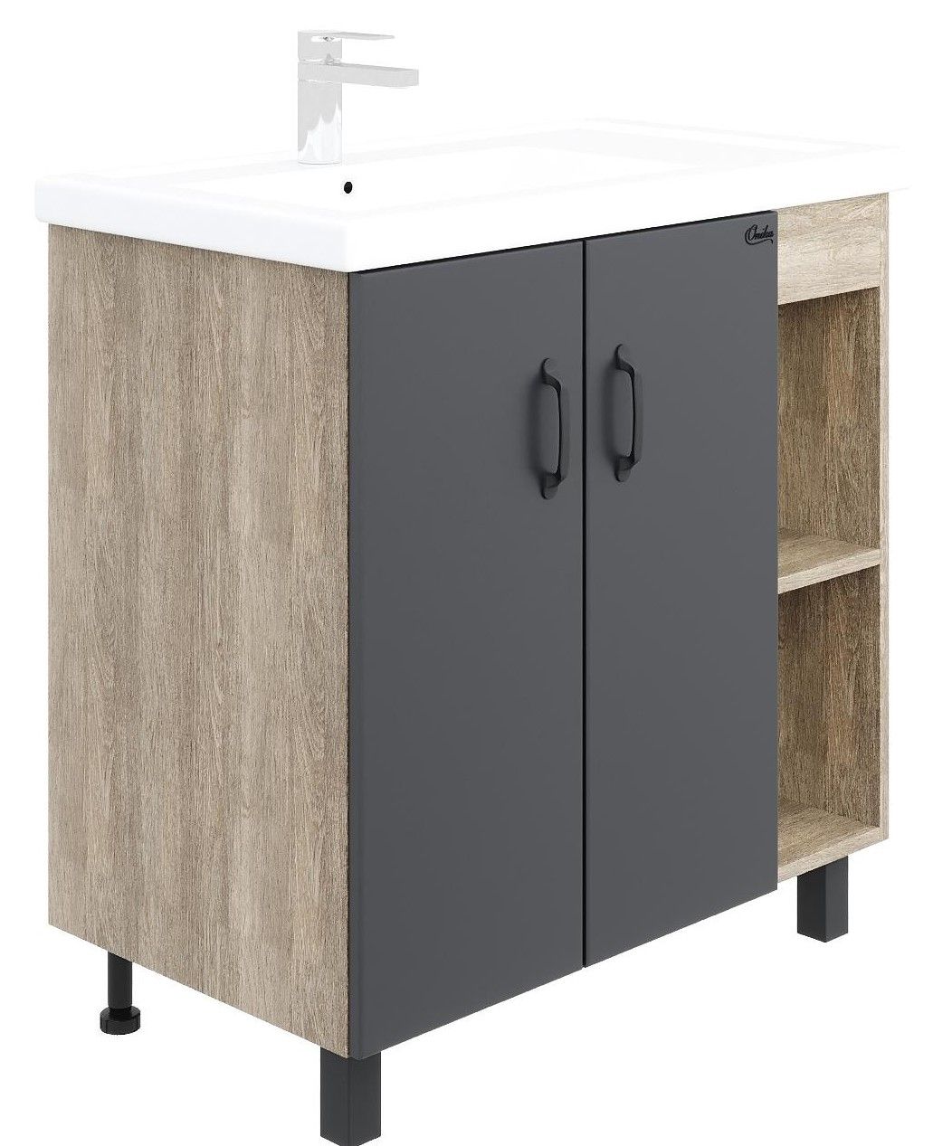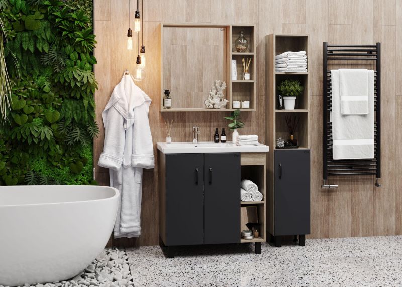В тумбе Onika Тимбер 80 удачно сочетаются контрастные цвета и фактуры: серый матовый фасад с покрытием SoftTouch, корпус цвета дуба с роскошной текстурой, черная матовая металлическая фурнитура.