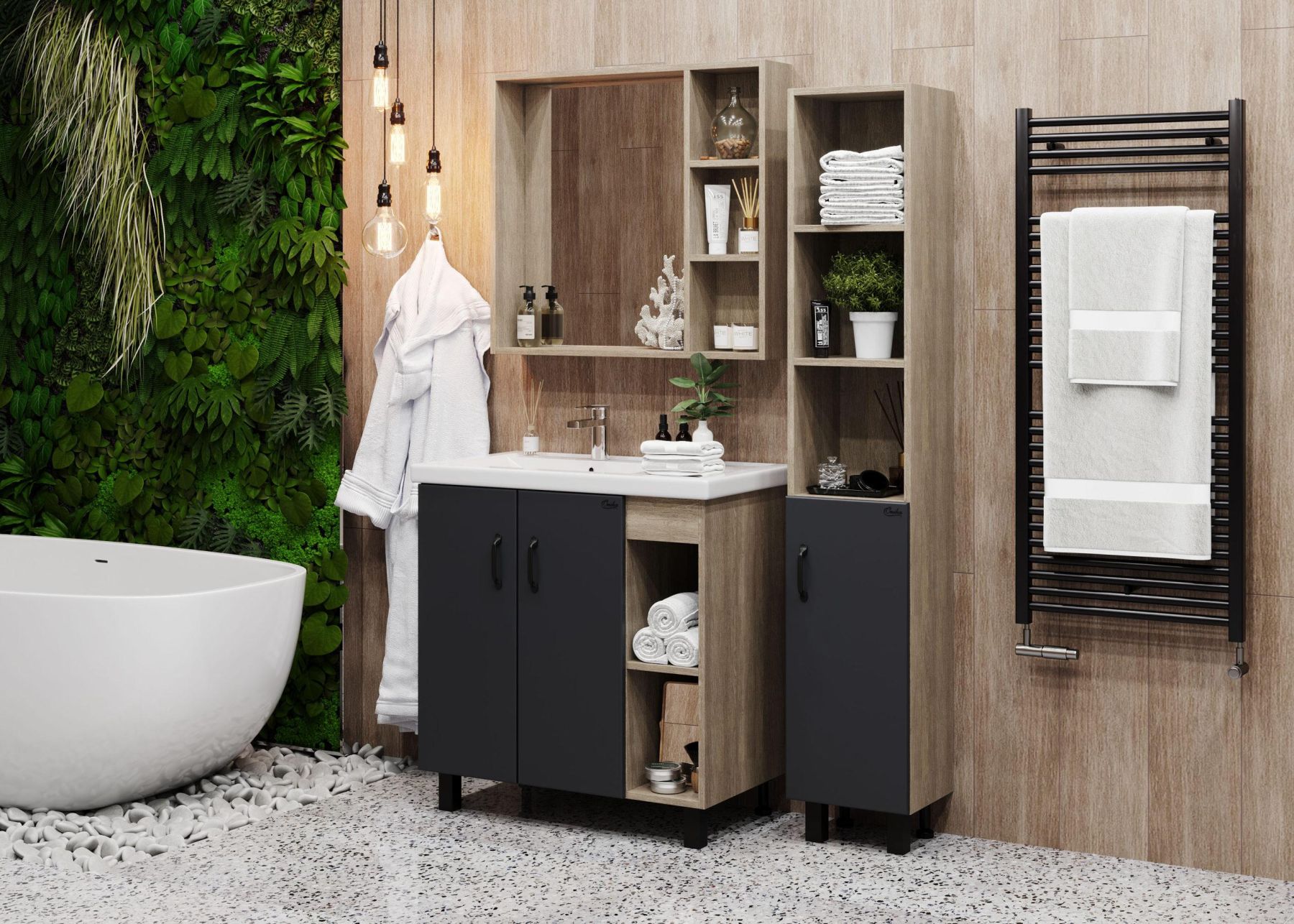Открытые полки справа обеспечивают быстрый доступ к часто используемым аксессуарам, а пространство за распашными дверцами слева, снабженными системой плавного закрывания, станет удобным местом для хранения различных бытовых принадлежностей.
