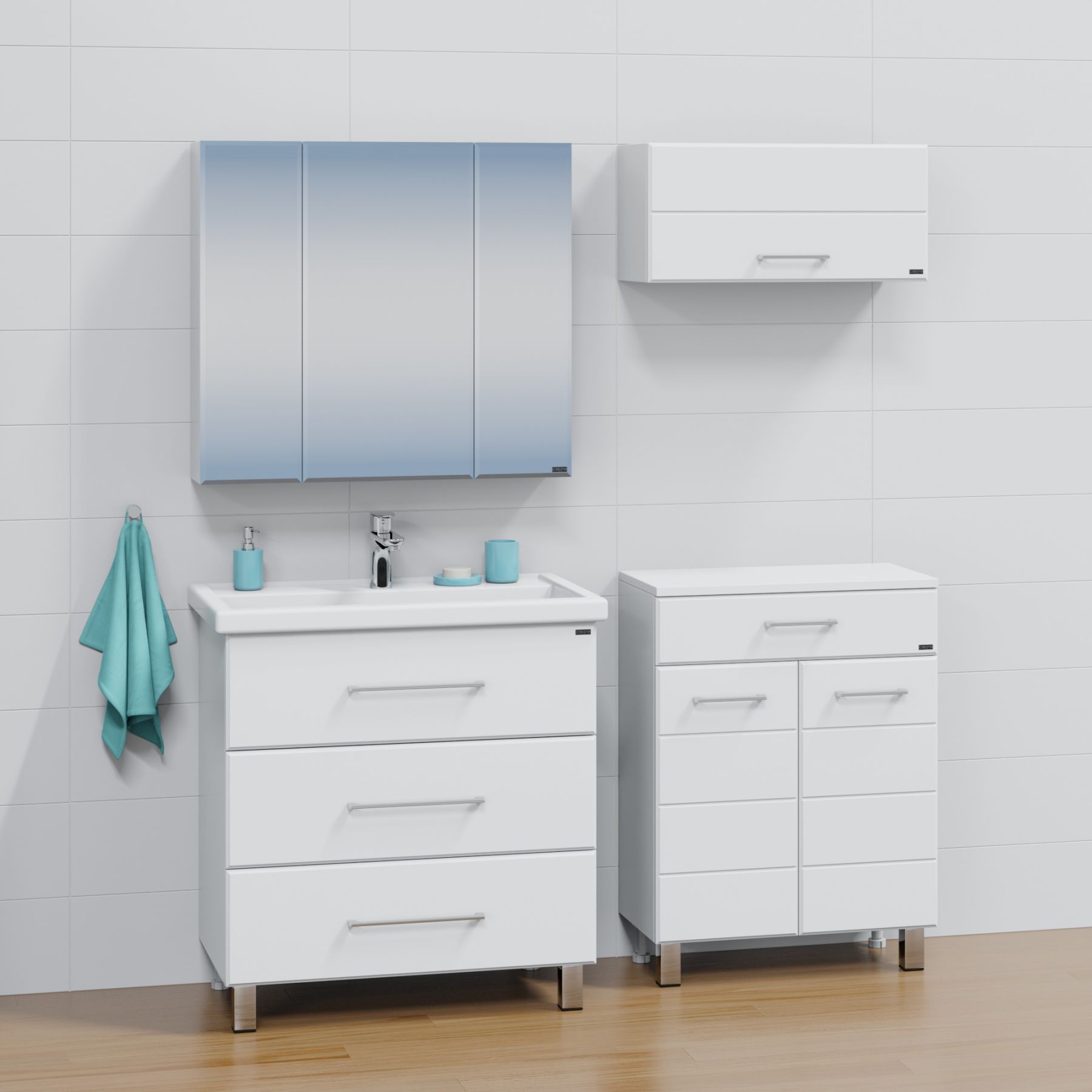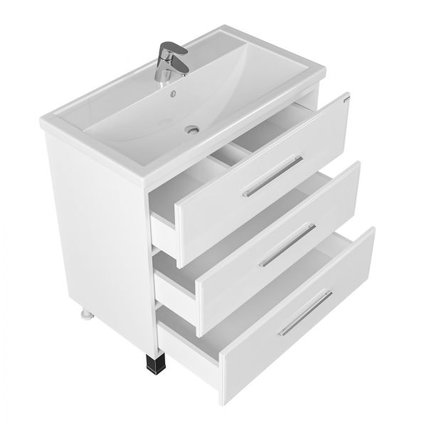 Тумба напольная Омега 80 для умывальника Фостер 80. Корпус изделия выполнен из влагостойкого ЛДСП, фасад из МДФ и покрыт пленкой. Выдвижные ящики тумбы оснащены шариковыми направляющими полного выдвижения.