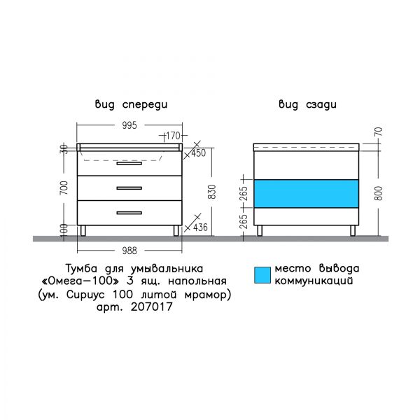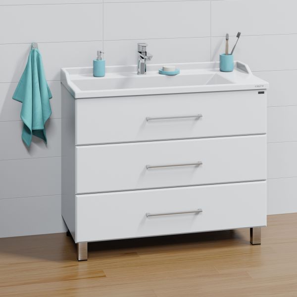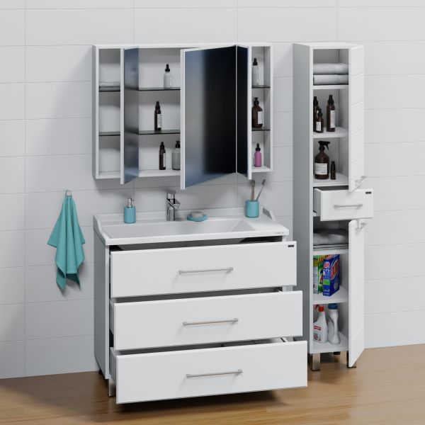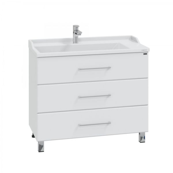 Тумба напольная Омега 100 для умывальника Sirius 100. Корпус изделия и  фасад  выполнен из МДФ. Фасад и боковины мебели покрыты глянцевой ПВХ плёнкой.Выдвижные ящики тумбы оснащены шариковыми направляющими полного выдвижения.