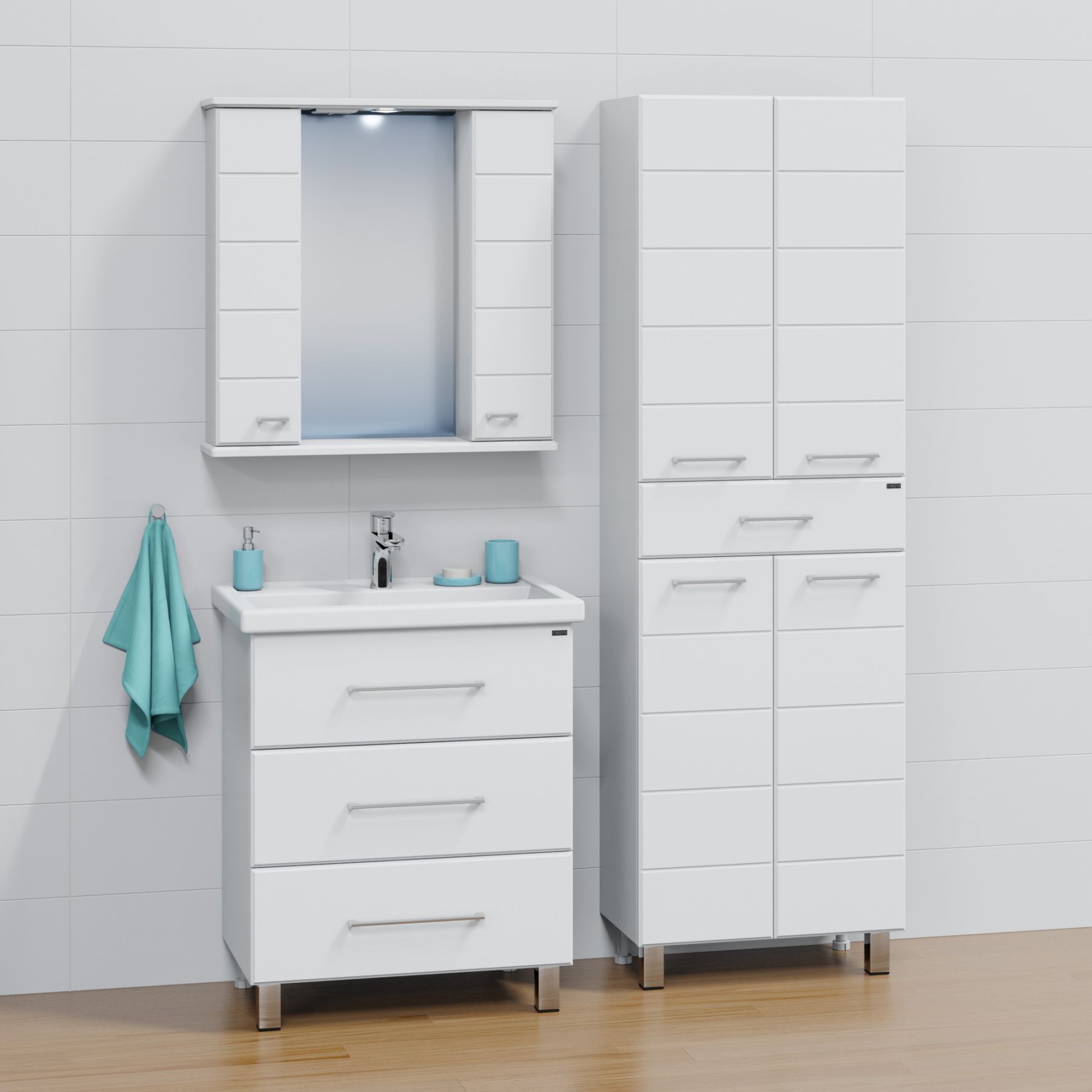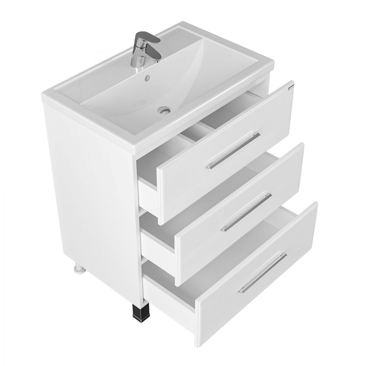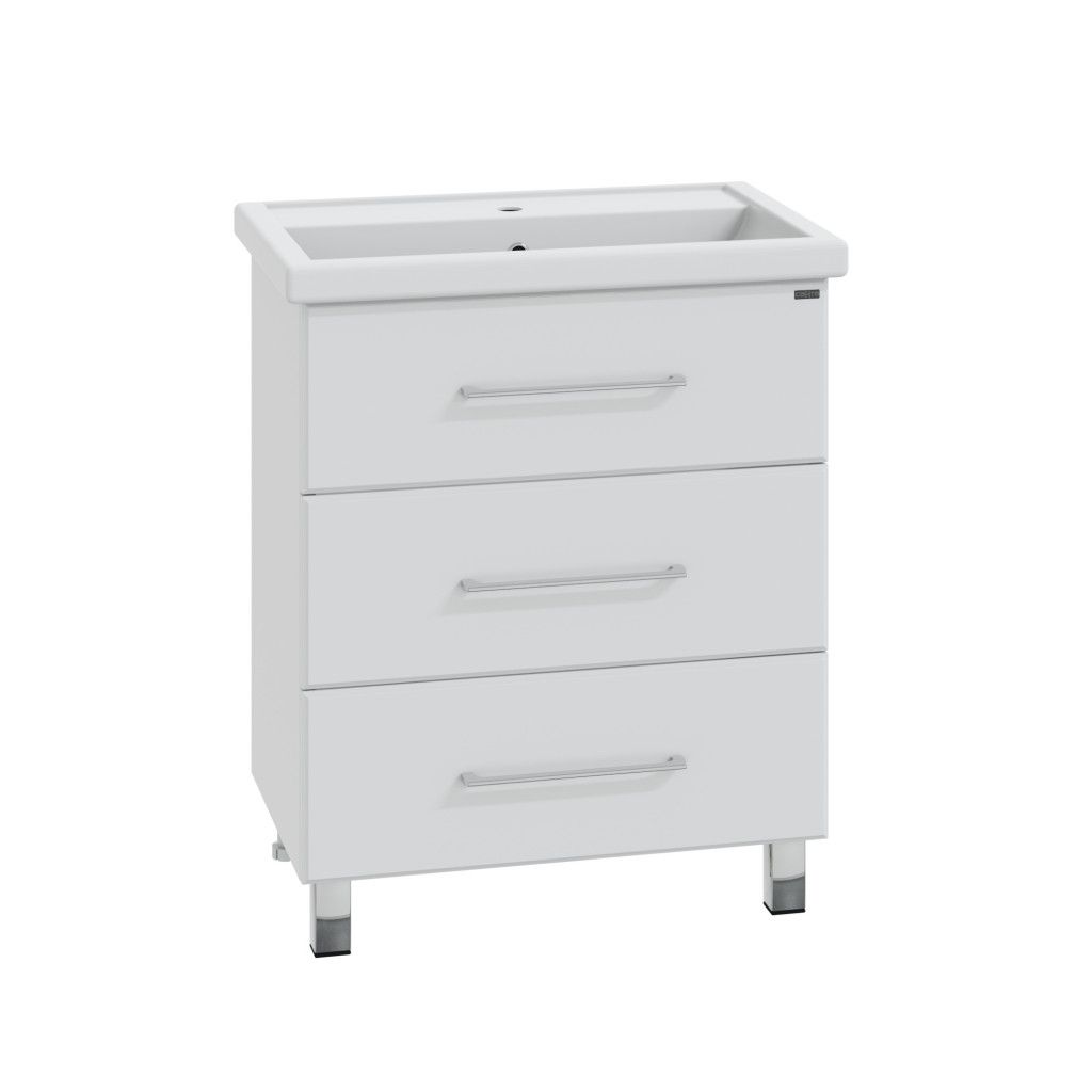 Тумба напольная Омега 70 для умывальника Фостер 70. Корпус изделия выполнен из влагостойкого ЛДСП, фасад из МДФ и покрыт пленкой. Выдвижные ящики тумбы оснащены шариковыми направляющими полного выдвижения.