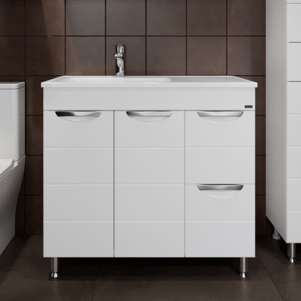 О коллекции: Коллекция Родос - современная и стильная мебель по приемлемой цене. Фасадные и боковые стенки мебели выполнены из МДФ покрытого ПВХ плёнкой. Тумба напольная "Родос 90" для умывальника "Венера 90". Тумба имеет оптимальную организацию внутреннего пространства. Комплектуется современной прямоугольной раковиной из литьевого мрамора с удобным крылом.