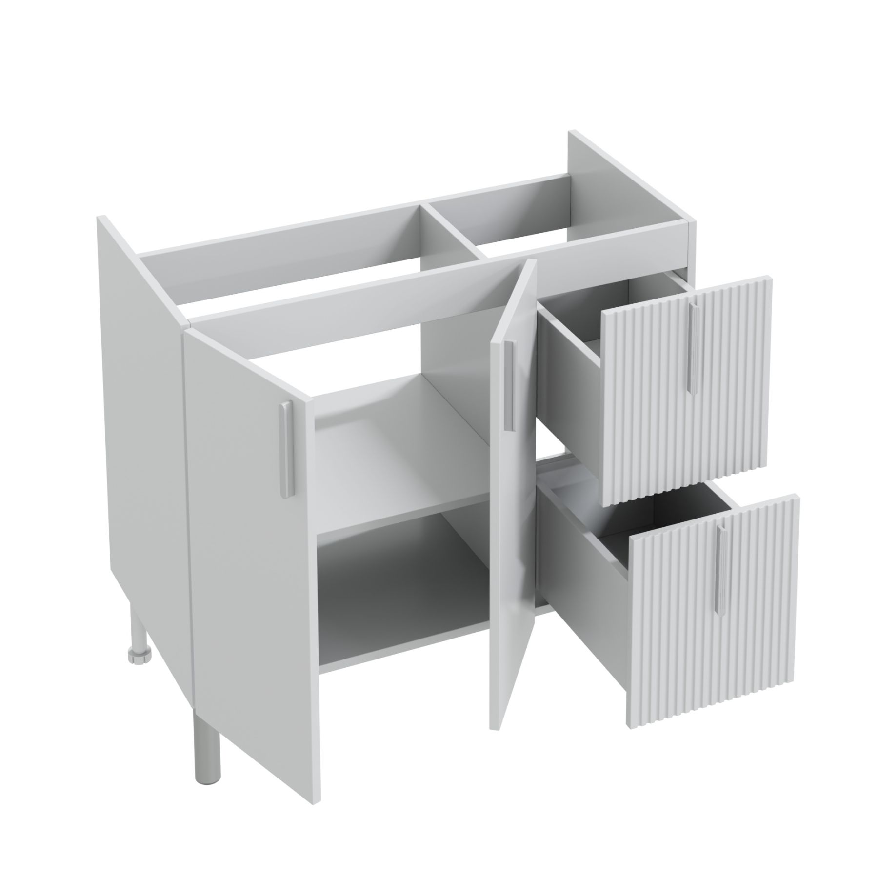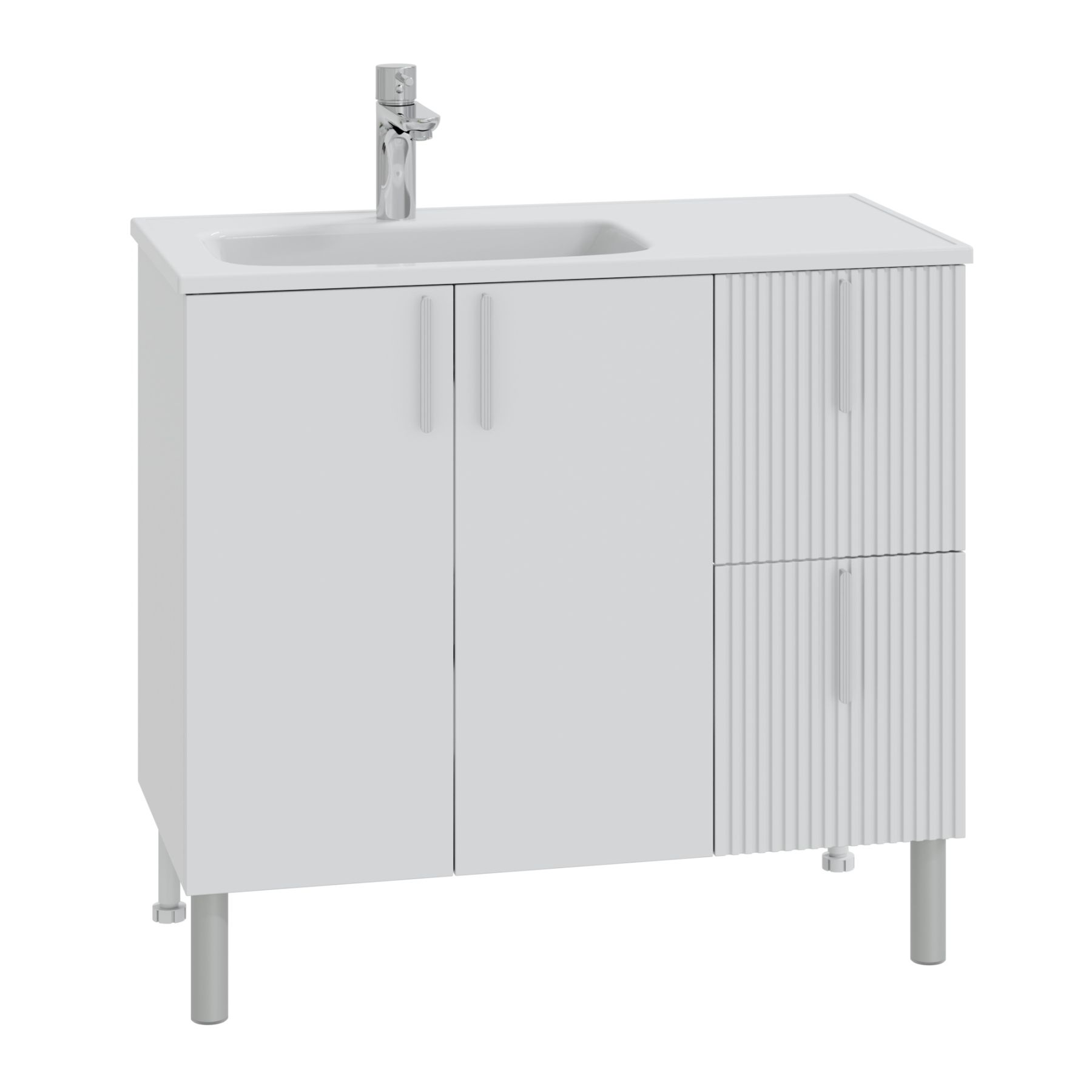 В комплекте с тумбой идут четыре стильные ручки и пять высоких ножек, которые обеспечивают надёжность и устойчивость всей конструкции.