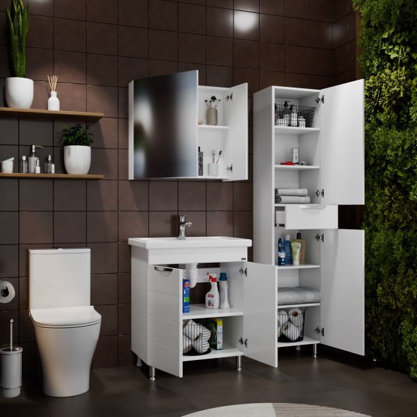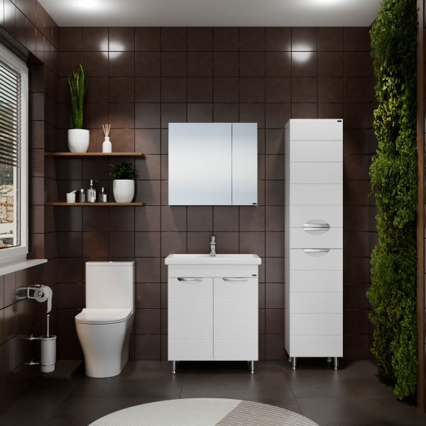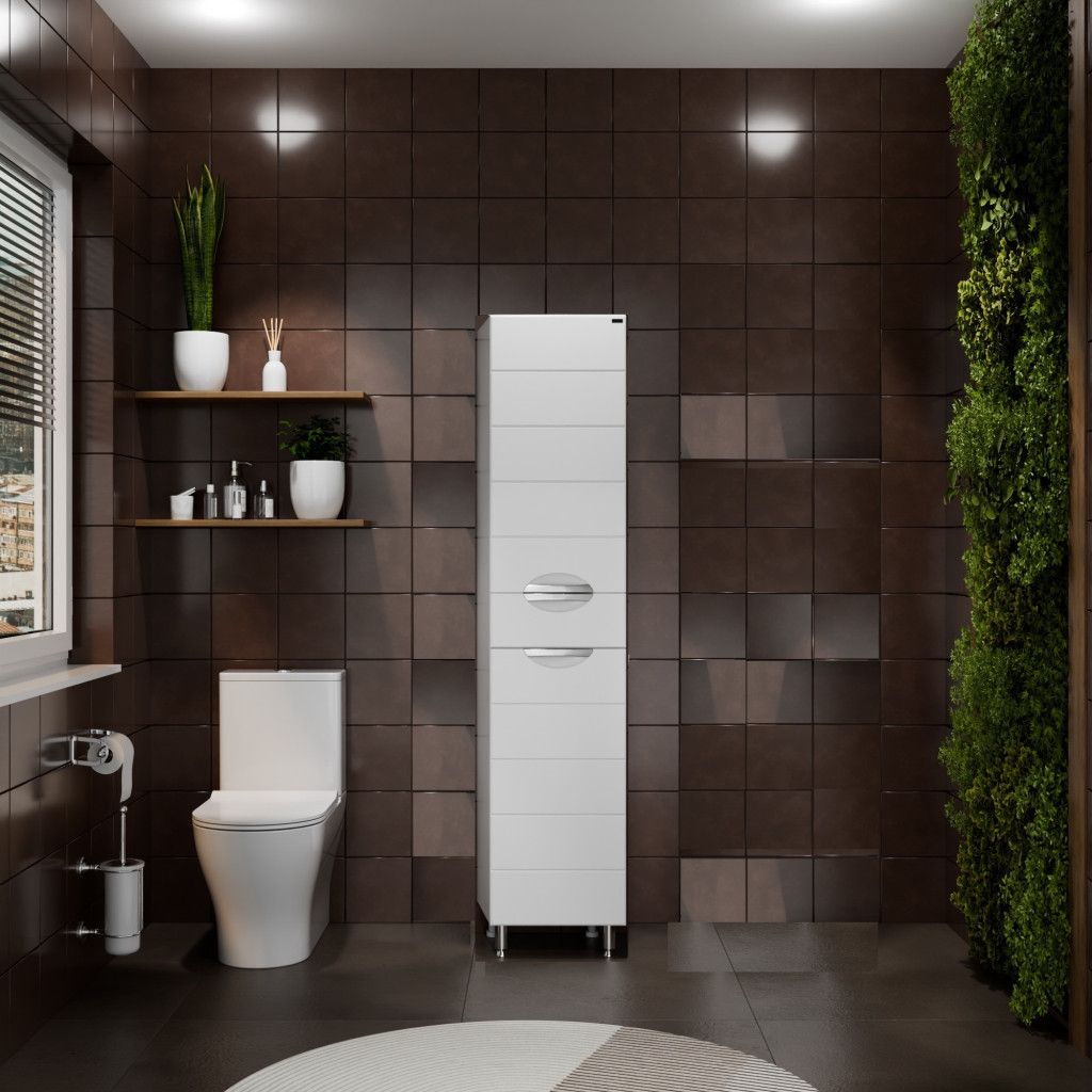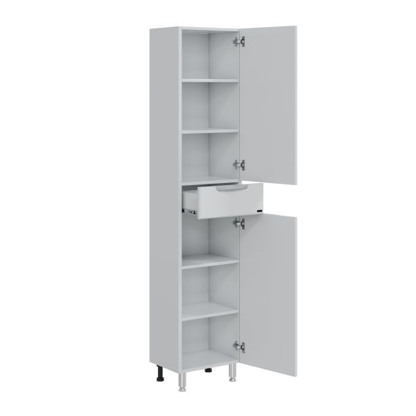 Комплектация: ручка хром - 3 шт., на дверках петли плавного закрывания - 2 шт., выдвижной ящик с шариковыми направляющими полного выдвижения - 1 шт., ножка хром - 2 шт., ножка пластик - 2 шт. Шкаф-пенал для ванной СаНта Родос 30 напольный. Фасады шкаф-пенала в ванную комнату изготовлены из МДФ, корпус колонны из влагостойкого ЛДСП. Фасад покрыт ПВХ пленкой. Пенал укомплектован несъемными полочками из ЛДСП, двумя хромированными ножками и двумя пластиковыми. Петли у колонны с плавным закрыванием. Открывание дверей распашное. Шкаф-пенал в ванную комнату вы можете приобрести в дополнение к тумбам из коллекции Санта Родос.