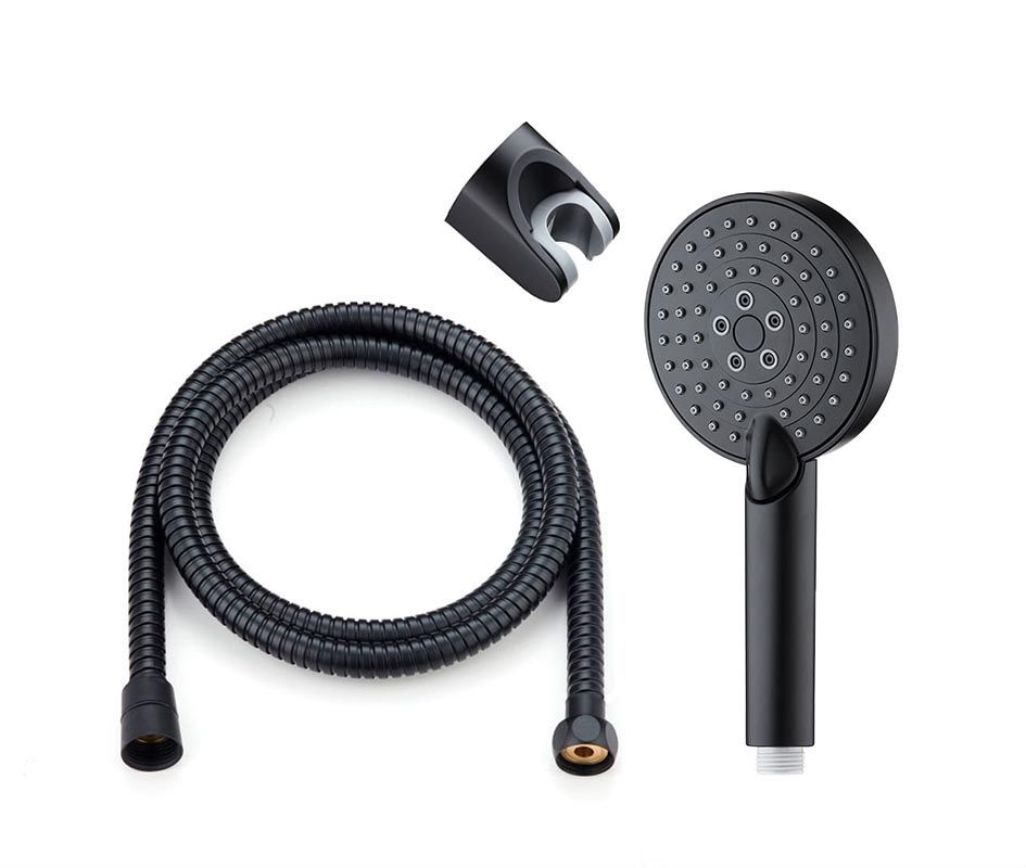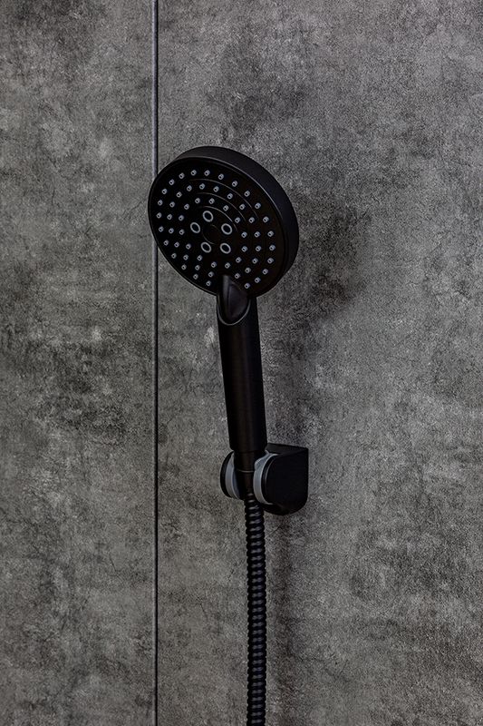 Душевой набор матовый черный: ручной душ d 110 мм., 3 режима струи, с силиконовыми наконечниками (защита от известкового налета RUB CLEAN), с системой AIR IN; настенный держатель ручного душа с регулировкой угла наклона (в шести позициях); душевой шланг 150 см в металлической оплетке, с защитой от перекручивания.