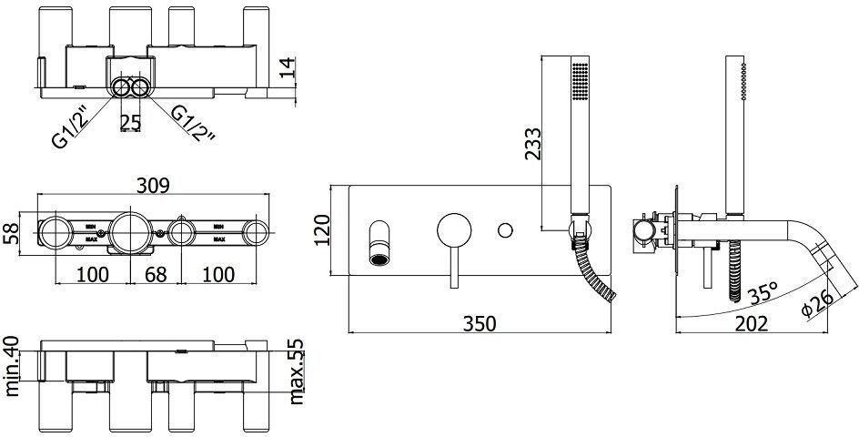 Смеситель для ванны встраиваемый на 2 выхода, накладка из нерж стали 350х120мм, душ гарнитур MASTER из металла, девиатор-кнопка, Черный матовыйСмеситель для ванны с душем Paffoni Light LIG001NO (с внутренней частью) предназначен для ванны с душем. Своим лаконичным дизайном и колористикой он внесет в интерьер помещения особое настроение, подчеркнув его своеобразие. Он выполнен из надежного материала латунь, нержавеющая сталь, который не ржавеет, а потому прослужит без ремонтов. Изделие является оптимальным примером достойного качества. Управление в смесителе предусмотрено однорычажное, что отвечает пожеланиям любителей такого типа смесителей. Высокую работоспособность и основательность смесителю гарантирует керамический картридж, безусловным плюсом которого является продуманная конструкция - залог бесперебойной работы в течение продолжительного времени. Не зря гарантия на смеситель – 5 лет, в течение которого компания Paffoni заверяет в его бесперебойной работе. Форма излива в смесителе - традиционная, а тип - фиксированный. При покупке учтите, что подводка у смесителя жесткая, что важно для его подключения.