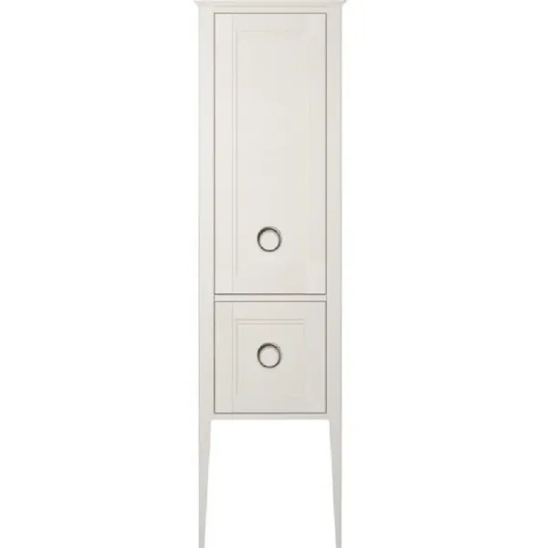 Высокий напольный пенал из массива ясеня с эффектом открытой поры, с распашной дверцей и выдвижным ящиком. Фасад украшен классической фурнитурой. Пространство за дверцей разделено несколькими регулируемыми полками. Петли для крепления дверцы расположены справа.