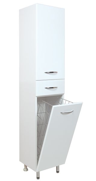 Большое отделение сверху за распашной дверцей с механизмом плавного закрывания, небольшой ящик с направляющими полного выдвижения посередине и отделение с корзиной для белья внизу шкафа обеспечит бережное хранение всех необходимых в ванной комнате вещей. Размер бельевой корзины: 180*240*650.