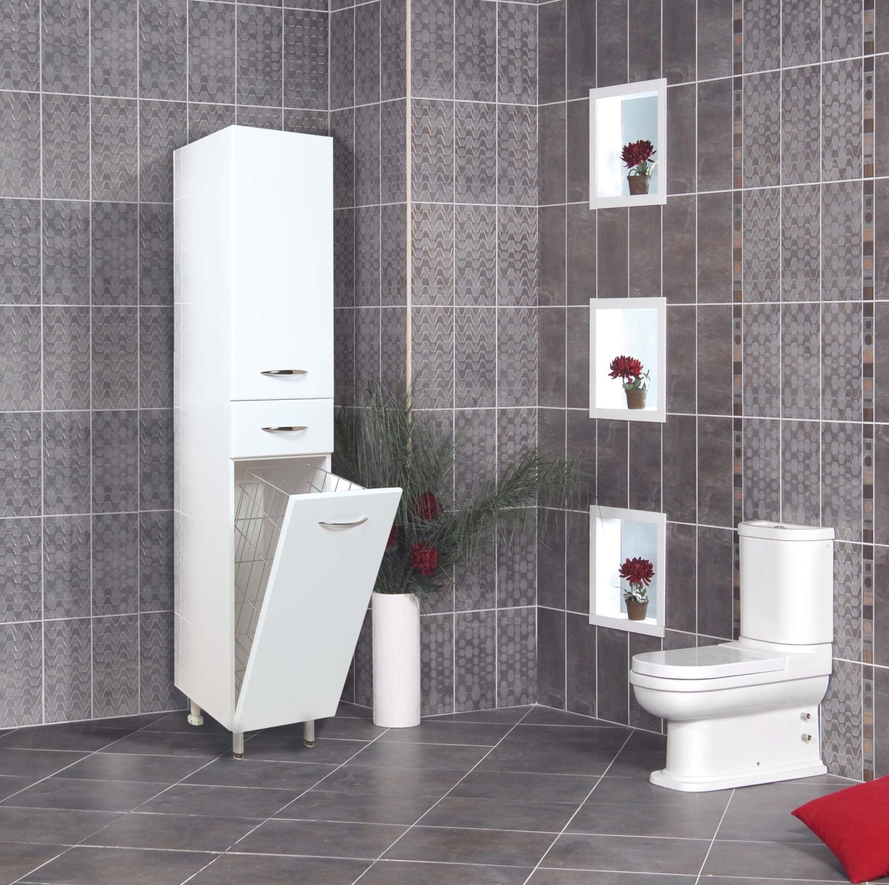 Большое отделение сверху за распашной дверцей с механизмом плавного закрывания, небольшой ящик с направляющими полного выдвижения посередине и отделение с корзиной для белья внизу шкафа обеспечит бережное хранение всех необходимых в ванной комнате вещей. Размер бельевой корзины: 270*370*630.