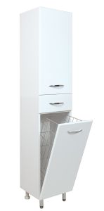 Большое отделение сверху за распашной дверцей с механизмом плавного закрывания, небольшой ящик с направляющими полного выдвижения посередине и отделение с корзиной для белья внизу шкафа обеспечит бережное хранение всех необходимых в ванной комнате вещей. Размер бельевой корзины: 270*370*630.