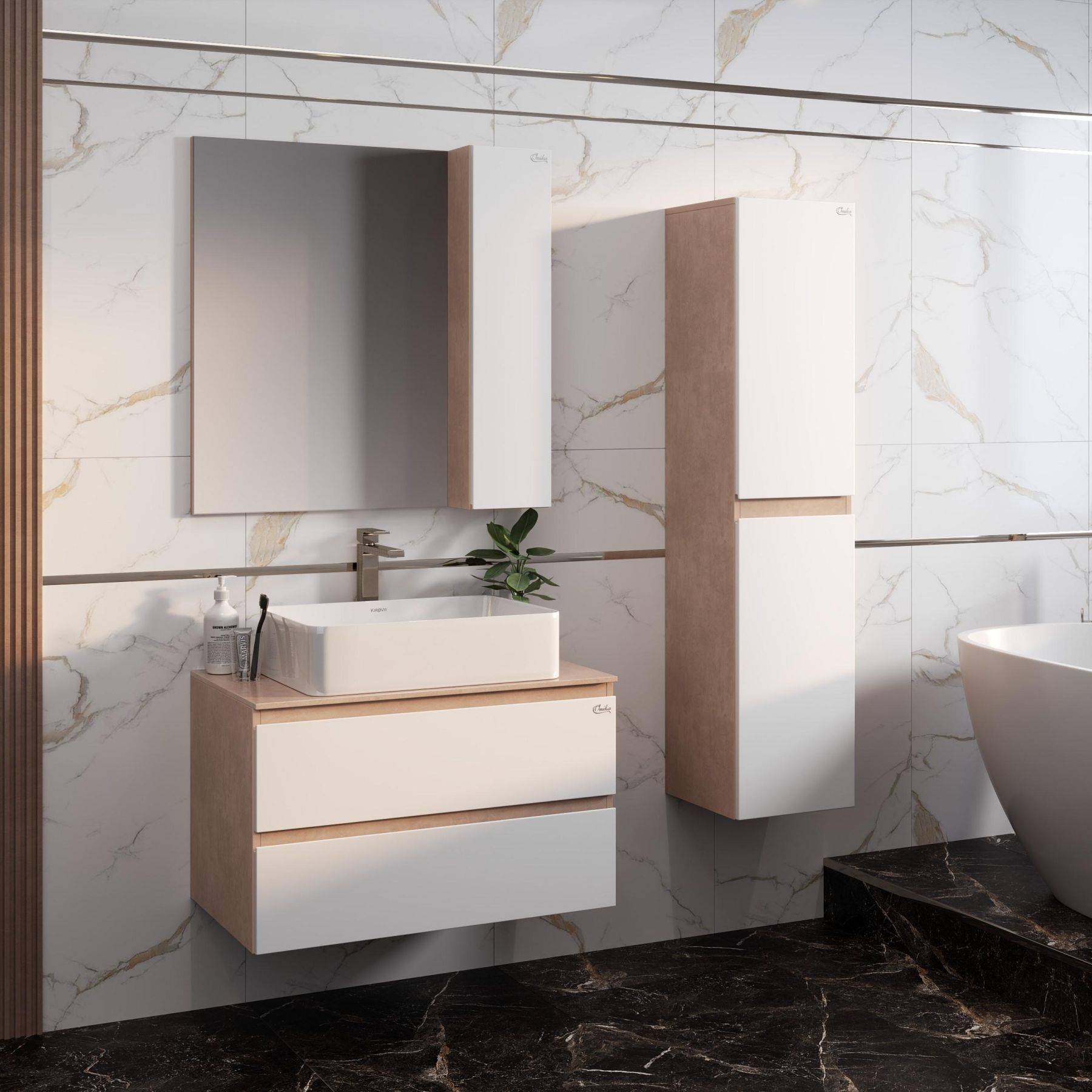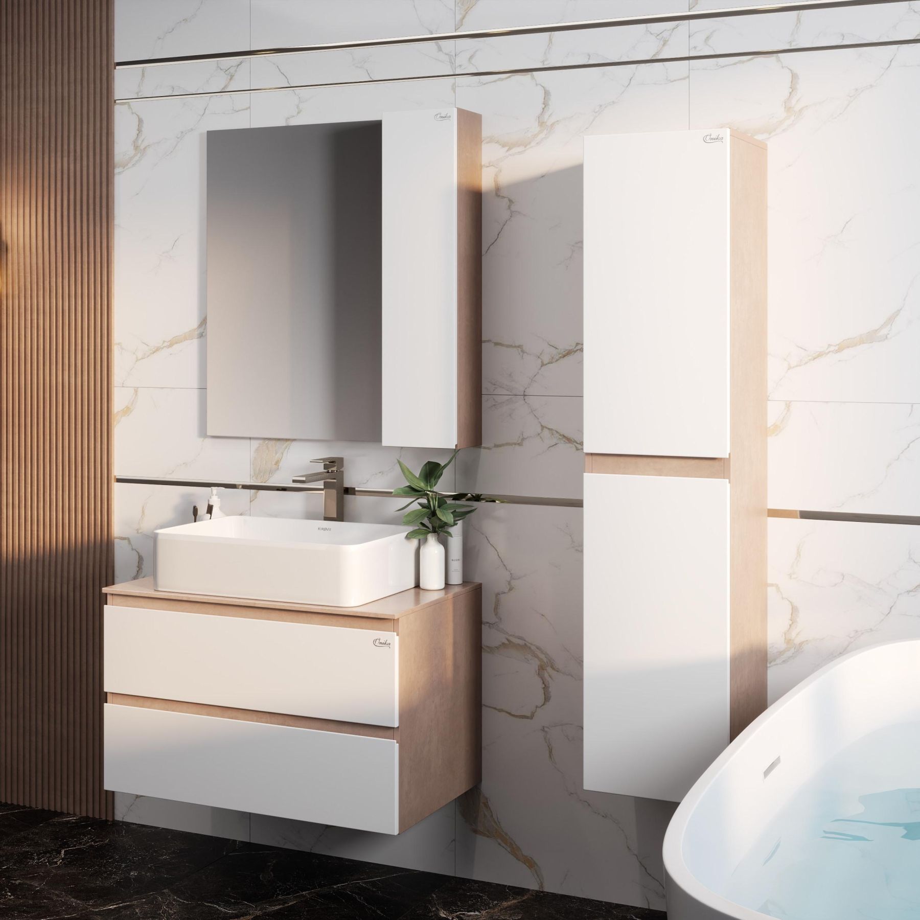 Подвесной шкаф пенал для ванной комнаты пенал Onika АЛЕСТА 35 отражает актуальные тенденции в дизайне мебели для ванной комнаты: минимализм и геометрия фасадов, белый глянец и текстура бетонного камня, отсутствие декора, скрытая встроенная ручка.