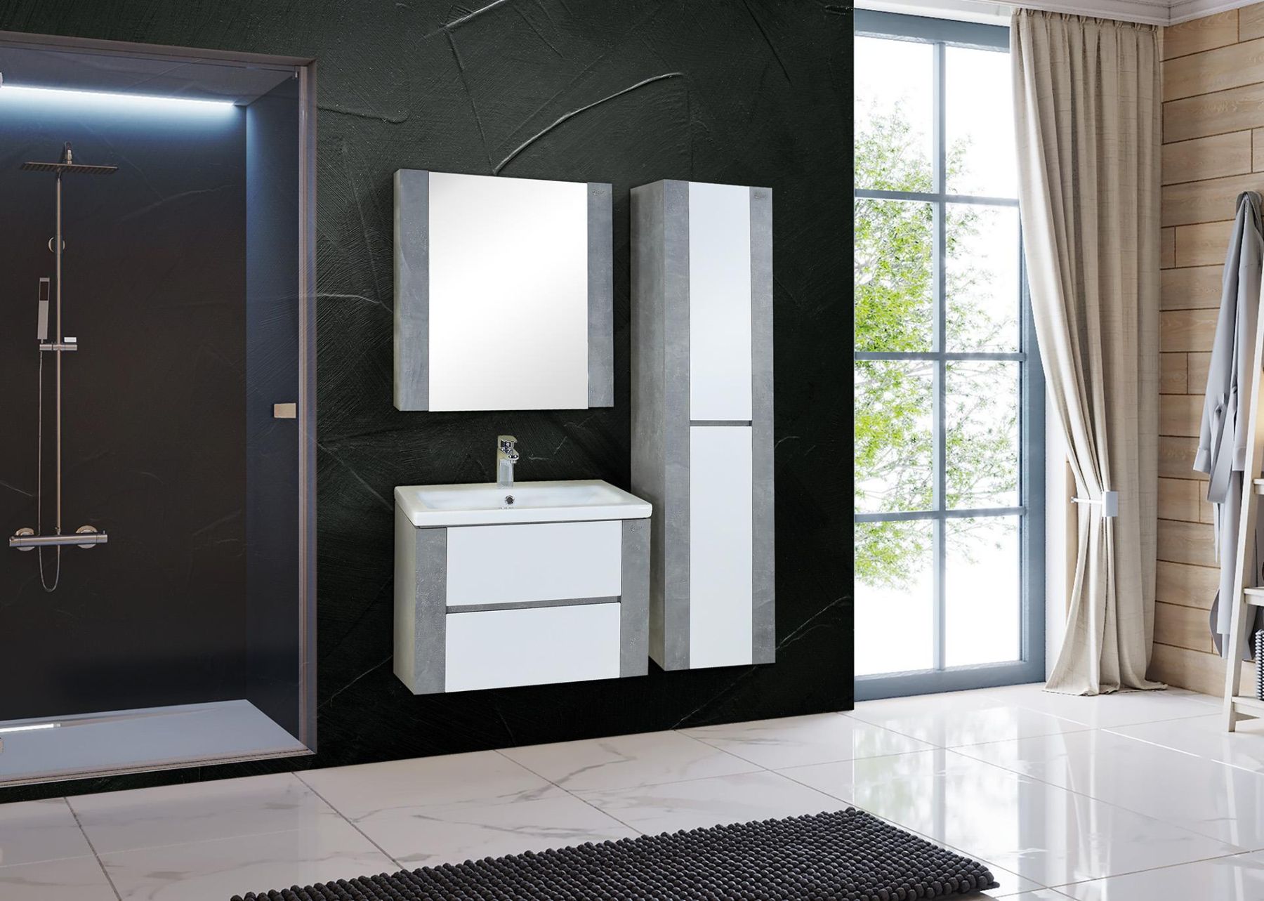 Подвесной пенал для ванной комнаты Onika СТОУН отражает актуальные тенденции в дизайне мебели для ванной комнаты: минимализм и геометрия фасадов, чёткость и лаконичность форм, отсутствие декора и стильный цвет светлого бетонного покрытия.