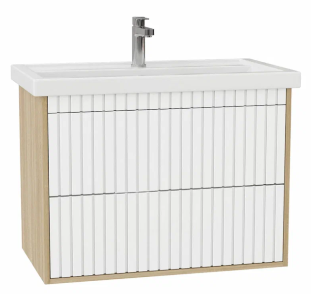 Рифленый белый матовый фасад с покрытием SoftTouch и корпус цвета дуба с роскошной текстурой подчеркнет изысканный вкус владельца и станет центральным элементом декора.
