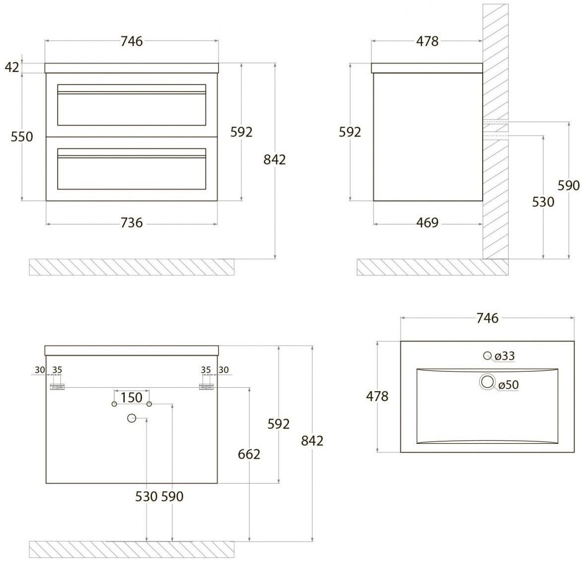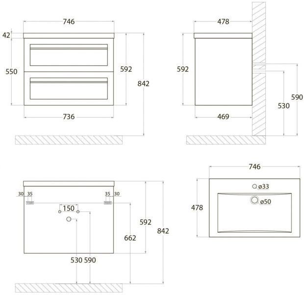 • Рекомендуемая высота от пола: 842 мм