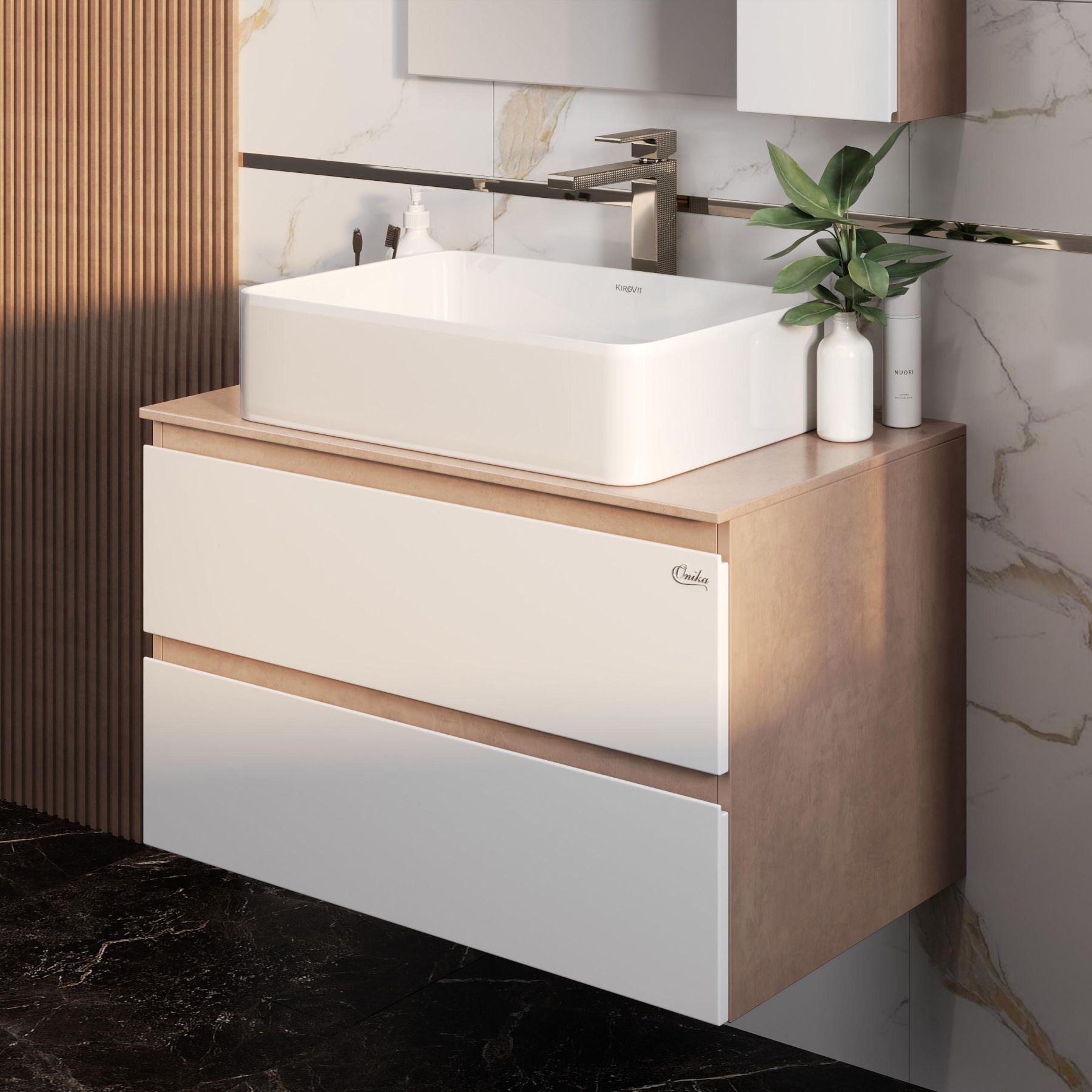 Подвесная тумба Onika Алеста 80 отражает актуальные тенденции в дизайне мебели для ванной комнаты: минимализм и геометрия фасадов, белый глянец и текстура бетонного камня, отсутствие декора, столешница из керамогранита и накладная раковина.