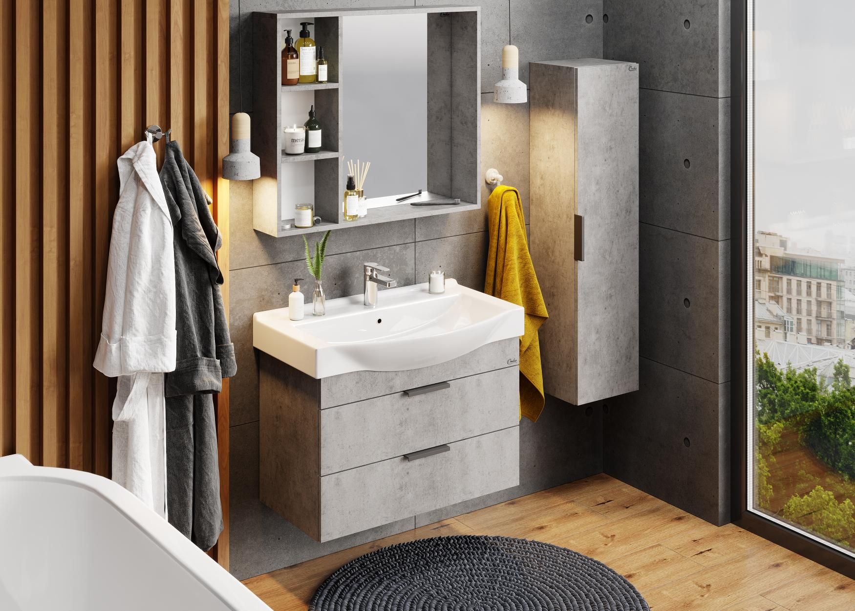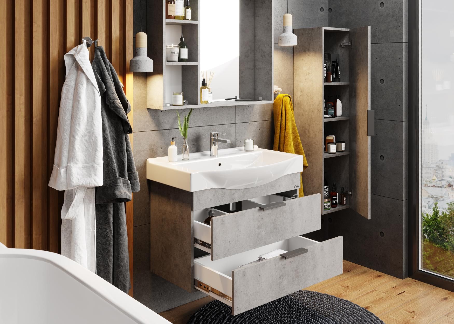 Подвесная тумба для ванной комнаты Onika Девис 80 отличается чёткой геометрией форм и создана для тех, кто ценит современный лаконичный дизайн, холодный брутальный эффект бетона, а также безупречное исполнение.