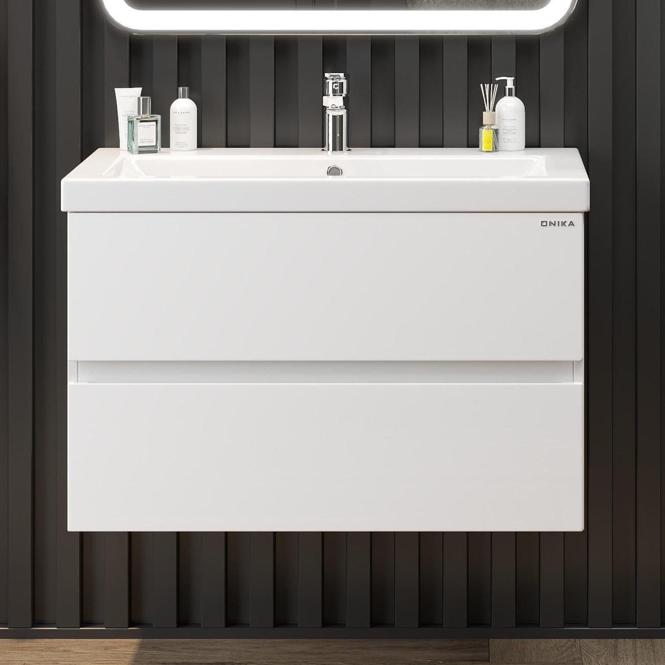 Подвесная тумба для ванной комнаты Onika Эвада 80 сочетает в себе стильный минималистичный дизайн, белую глянцевую поверхность и высочайшее качество исполнения.