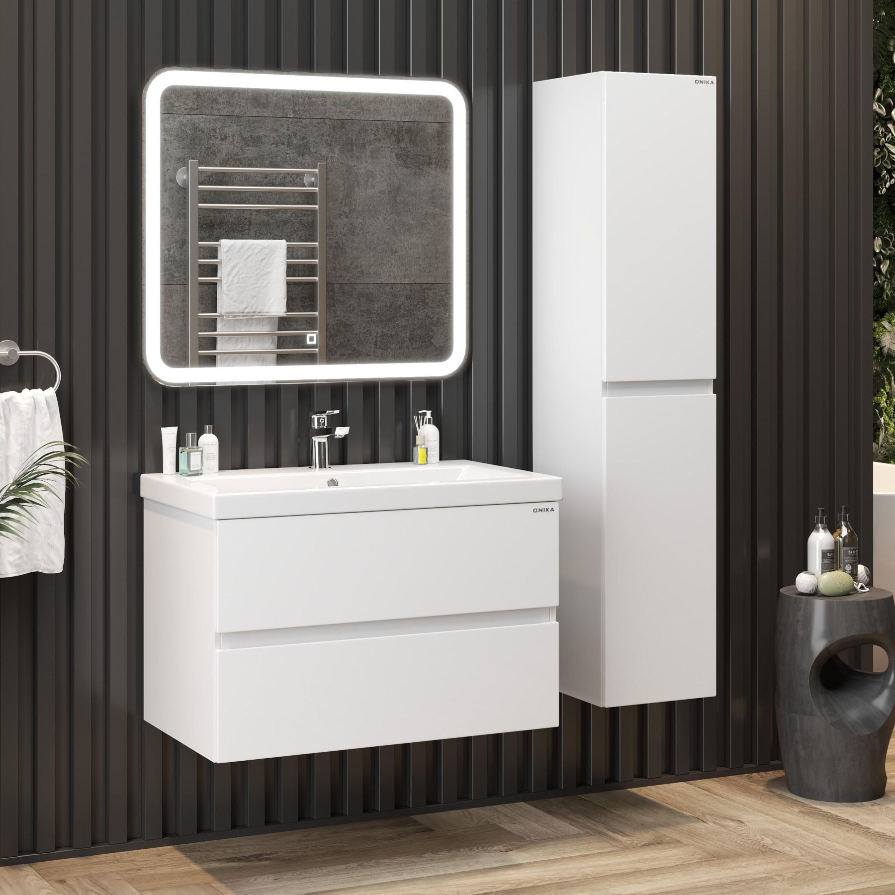 Подвесная конструкция значительно упрощает процесс уборки в ванной комнате, а ручки, изящно интегрированные в фасады, позволяют сделать эксплуатацию более удобной и практичной.