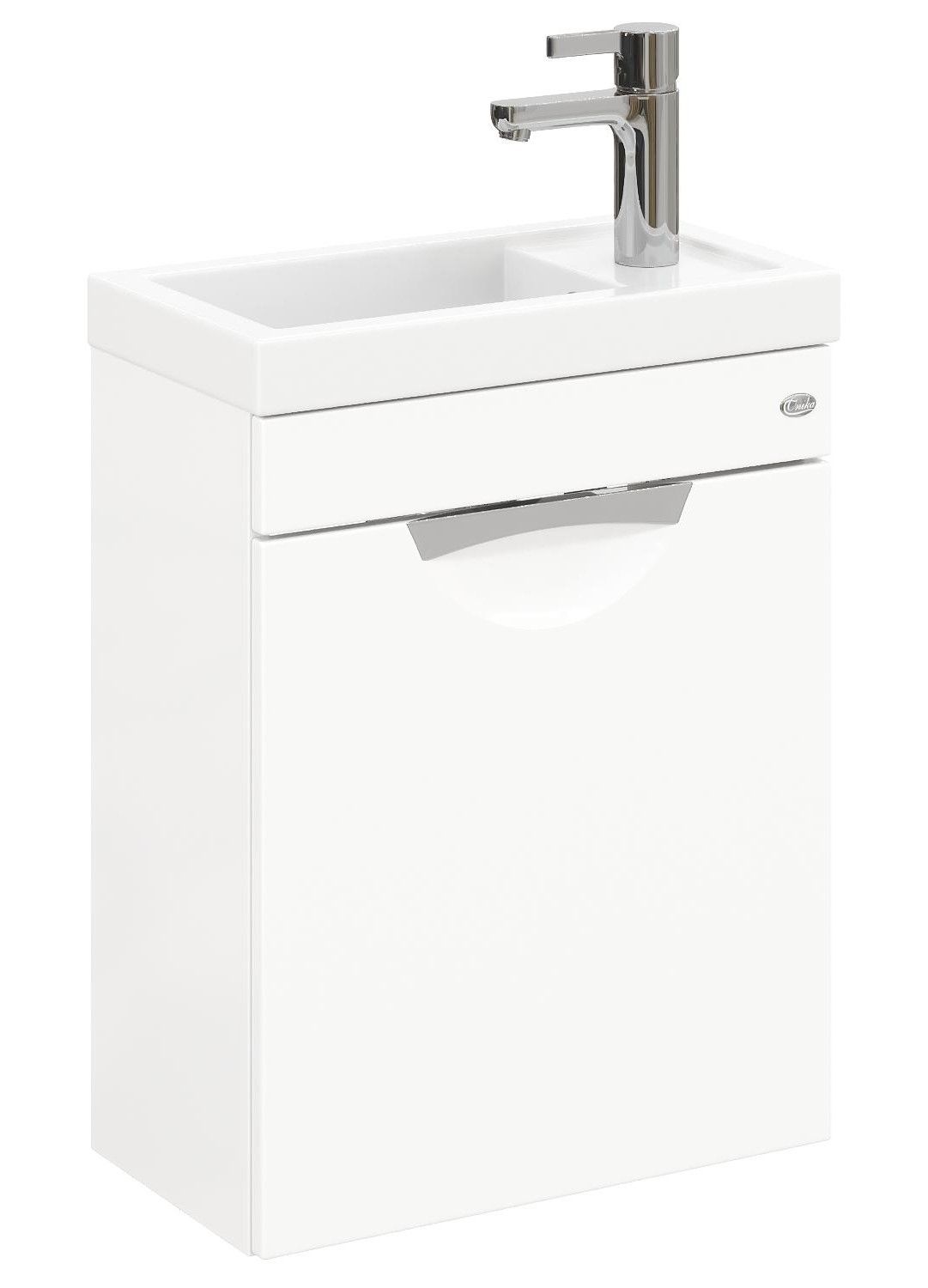 Главные особенности - это белая глянцевая поверхность, миниатюрные габариты, удобная врезная хромированная ручка на дверце с системой плавного закрывания, за которой есть место для размещения необходимых мелочей.