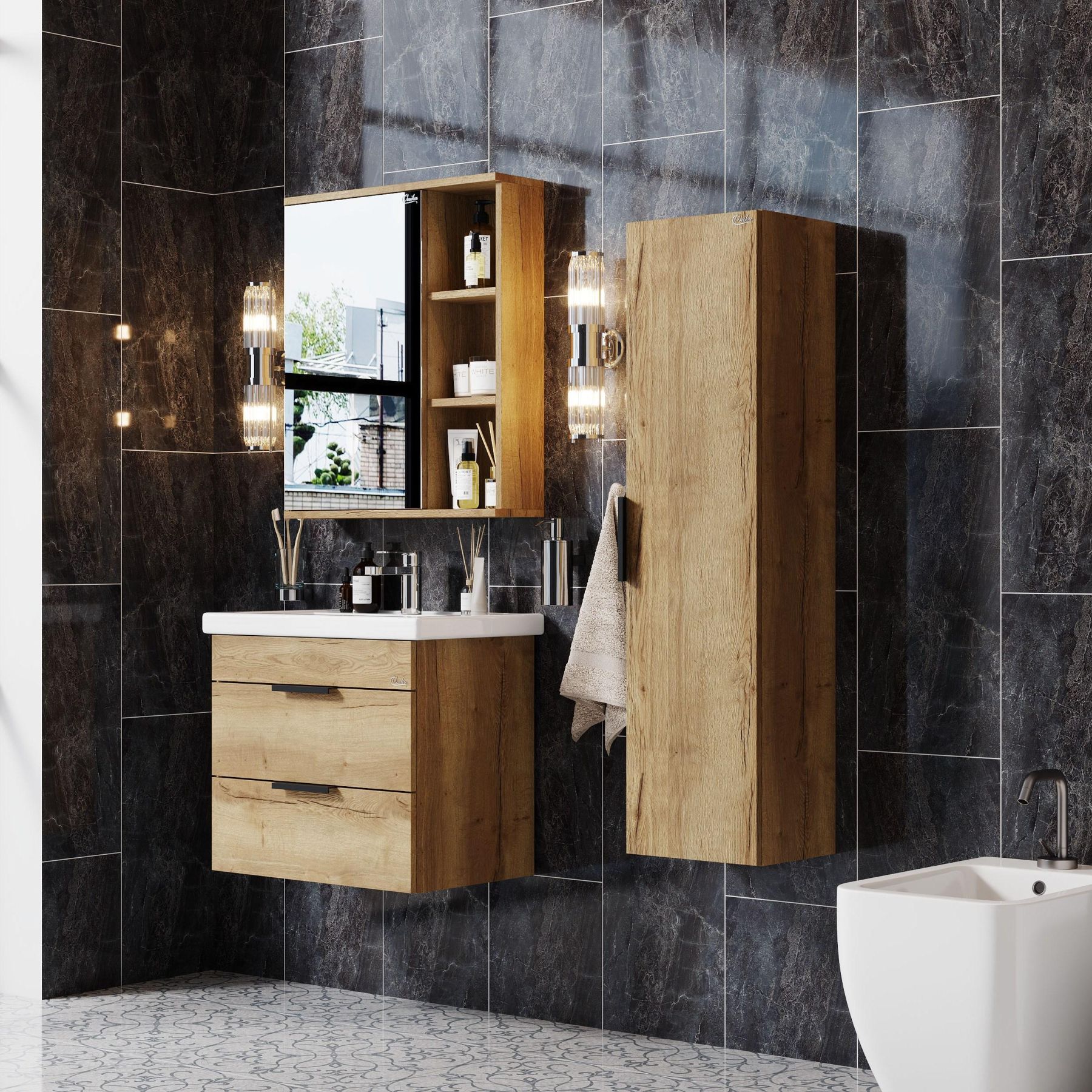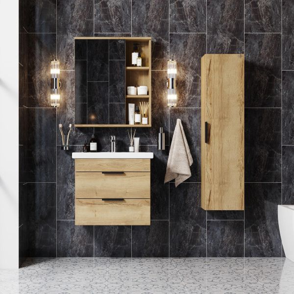 Подвесная тумба для ванной комнаты Onika Легран 60 - это сочетание насыщенного древесного декора и благородства металла: роскошная текстура и натуральный цвет дуба дают теплоту, а матовые металлические ручки добавляют урбанизма и солидности.