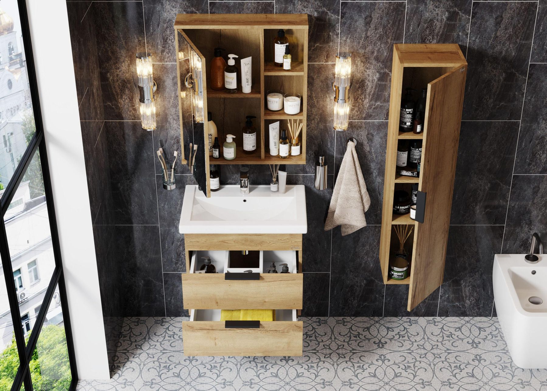 Подвесная тумба для ванной комнаты Onika Легран 70 - это сочетание насыщенного древесного декора и благородства металла: роскошная текстура и натуральный цвет дуба дают теплоту, а матовые металлические ручки добавляют урбанизма и солидности.