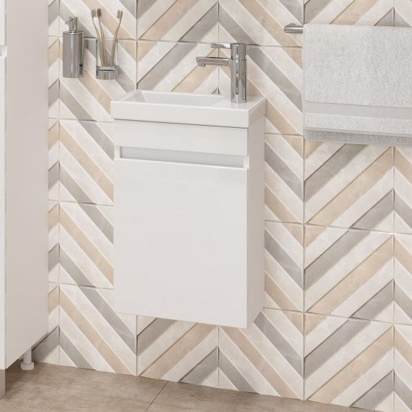 Тумба имеет белый глянцевый фасад и строгие формы без декора. За дверцей с интегрированной ручкой скрывается пространство с полкой для размещения необходимых бытовых принадлежностей.
