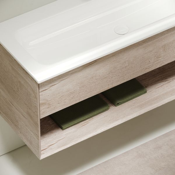 Тумба подвесная SANCOS Marmi 1.0 1195х445х520 c одним ящиком оснащенным доводчиками скрытого монтажа с системой Soft close (плавного закрывания) и открытой нишей, c фрезерованной ручкой по всей длине фасада, дуб галифакс натуральный, арт. MR1.0120EG