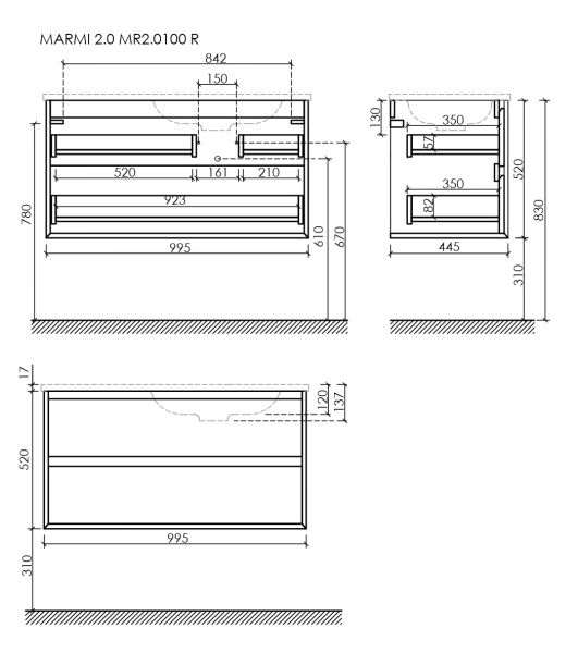 Тумба подвесная SANCOS Marmi 1.0 правая, 995х445х520, c двумя ящиками оснащенными доводчиками скрытого монтажа с системой Soft close (плавного закрывания), c фрезерованными ручками по всей длине фасада, цвет дуб галифакс натуральный, арт. MR1.0100REG