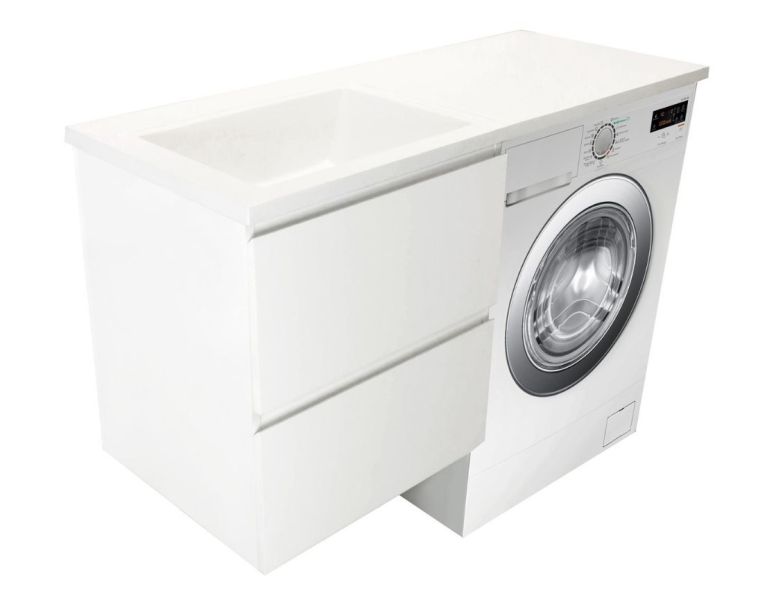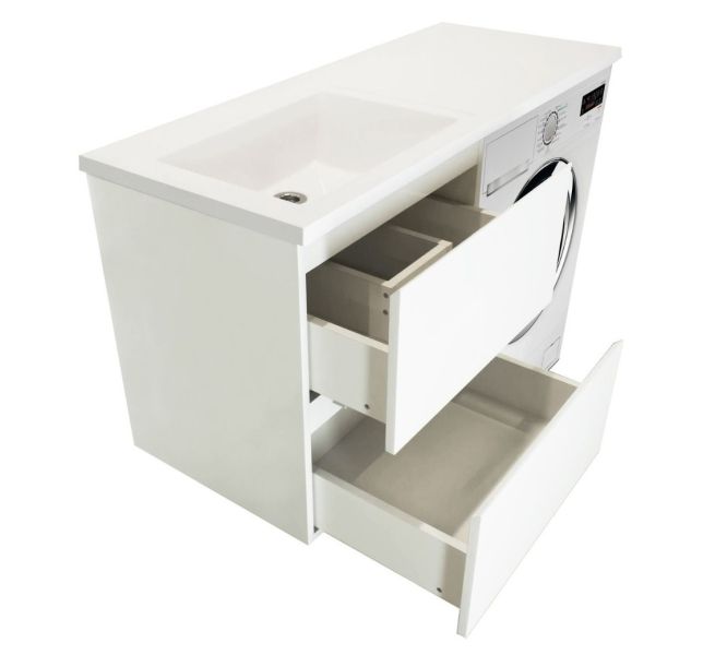 Коллекция мебели для ванной комнаты Dallas Luxe покоряет своей удивительной простой и функциональностью. Стильная лаконичная тумба, укомплектована раковиной из литьевого мрамора с удобной чашей. Стиральная машина устанавливается под столешницей, за счет чего экономит место в ванной комнате. В тумбе имеются два ящика. Нижний ящик тумбы – широкий и вместительный – предназначен для крупных предметов, а в верхнем имеется специальная организация пространства, позволяющая хранить мелкие вещи.