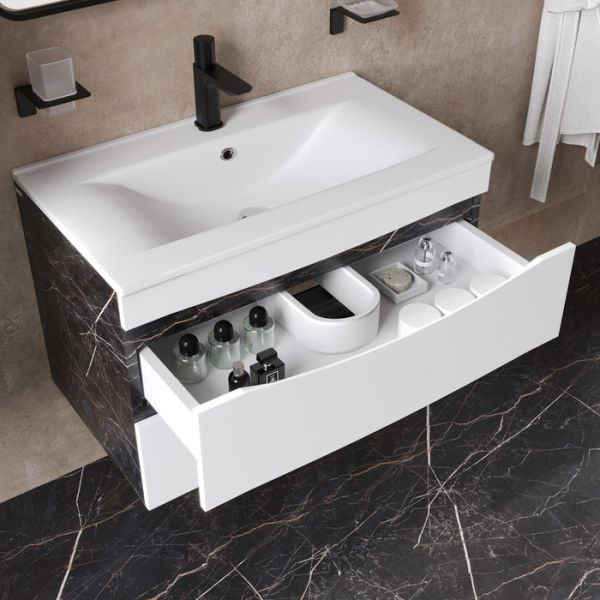 Стильная подвесная тумба Cloud из влагостойкой ЛДСП, где гармонично сочетаются боковины под черный мрамор, матовые белые фасады с интегрированными ручками и тонкий умывальник. Обновление популярной коллекции мебели Cloud и украшение современной ванной.