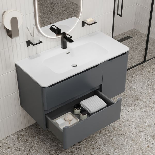 Вместительная подвесная тумба с плоским умывальником Edifice стильного темно-серого цвета – воплощение современного минимализма. Мягкие линии корпуса в сочетании с удобными интегрированными ручками выглядят свежо и актуально. Смотрится аккуратно, легко и не усложняет процесс уборки в ванной благодаря подвесной конструкции.