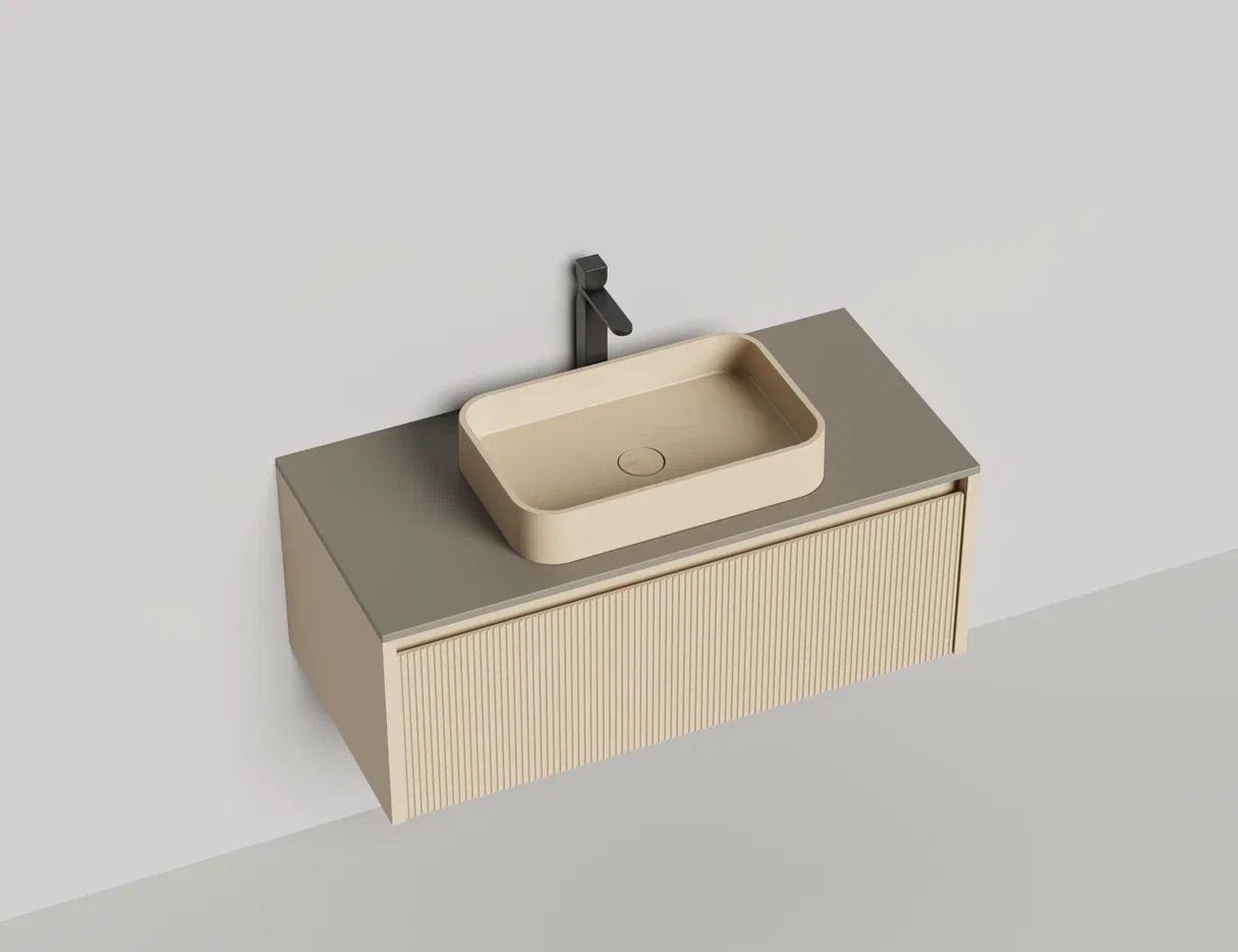- Тумба и столешница из материала S-Stone в сборе (накладные раковины укомплектованы донным клапаном и поставляются в отдельной коробке)