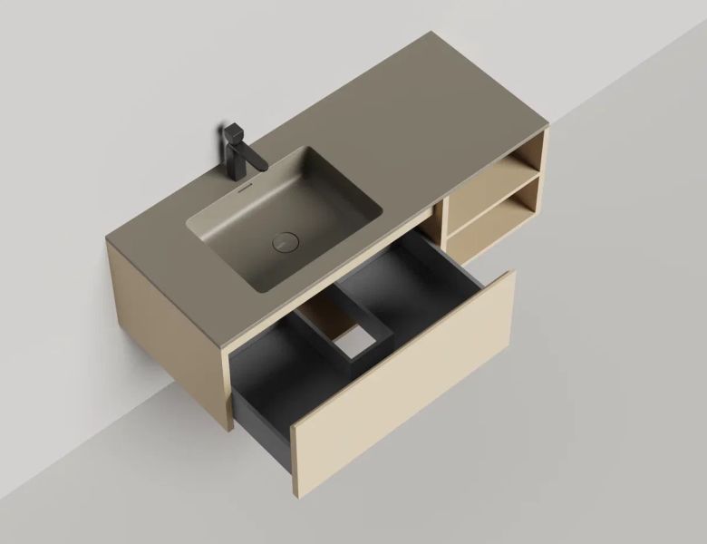 Наполнение для тумбы включает: блоки ячеек для тумб, коврики и комплект внутренней подсветки, которые помогут организовать пространство и создать более удобный доступ к вещам.Тумба DOMINO, дополненная столешницей COSTA из каменного литья S-Stone, гарантирует практичность и простоту ухода.