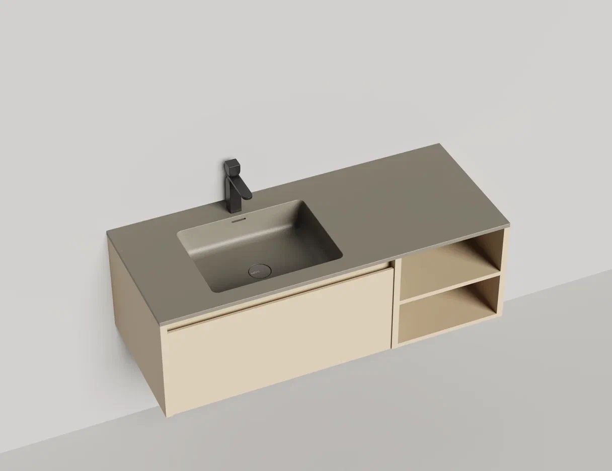 • Тумба и столешница из материала S-Stone в сборе (накладные раковины укомплектованы донным клапаном и поставляются в отдельной коробке)