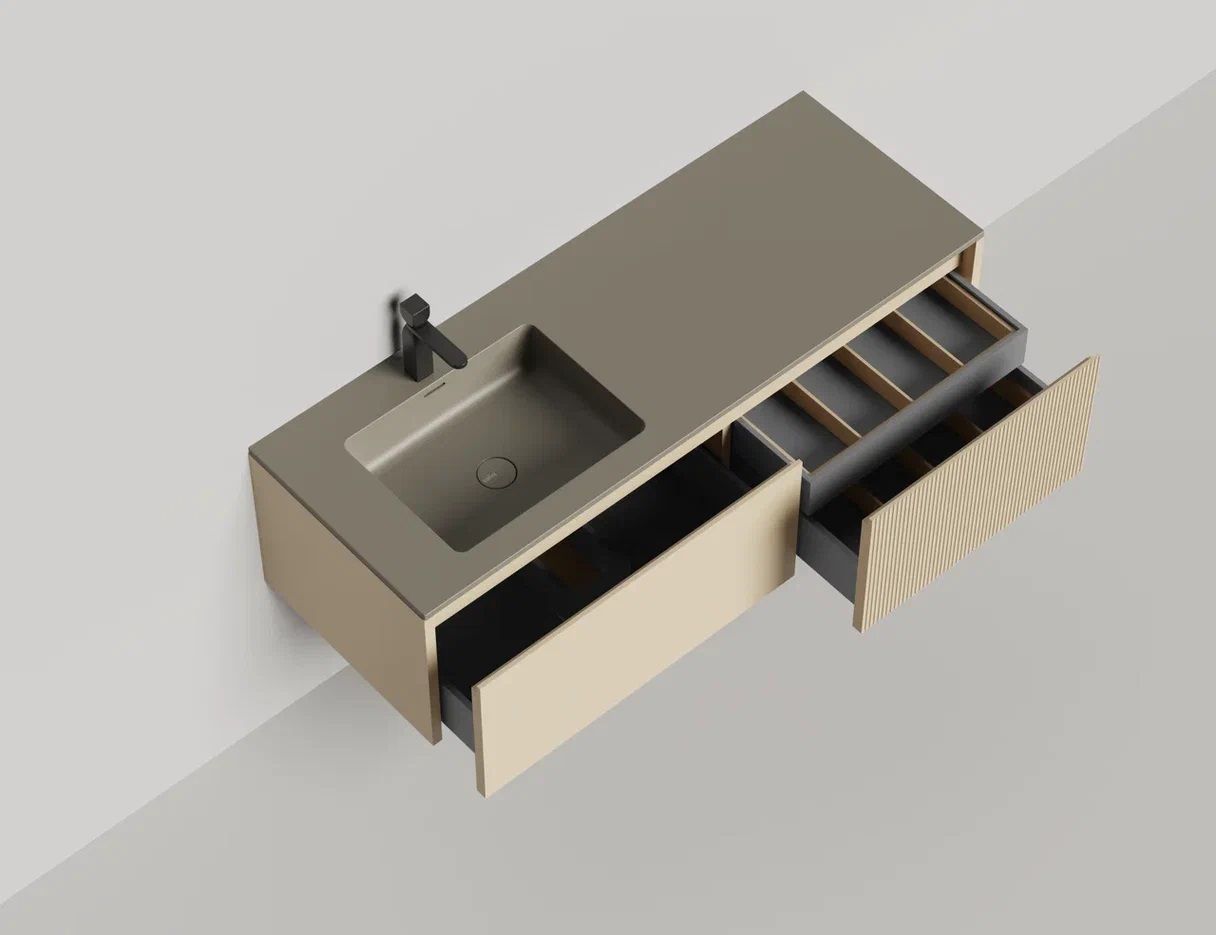 Наполнение для тумбы включает: блоки ячеек для тумб, коврики и комплект внутренней подсветки, которые помогут организовать пространство и создать более удобный доступ к вещам.Тумба DOMINO, дополненная столешницей COSTA из каменного литья S-Stone, гарантирует практичность и простоту ухода.