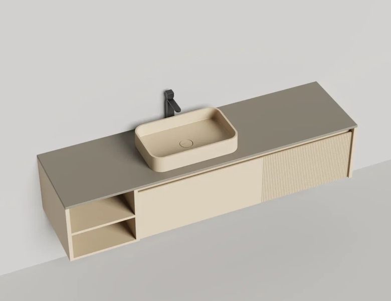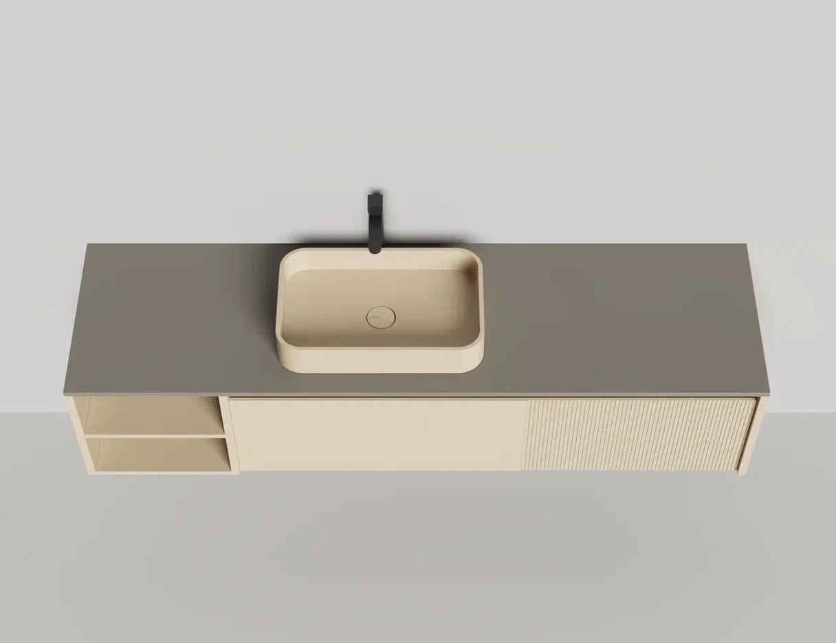 • Тумба и столешница из материала S-Stone в сборе (накладные раковины укомплектованы донным клапаном и поставляются в отдельной коробке)