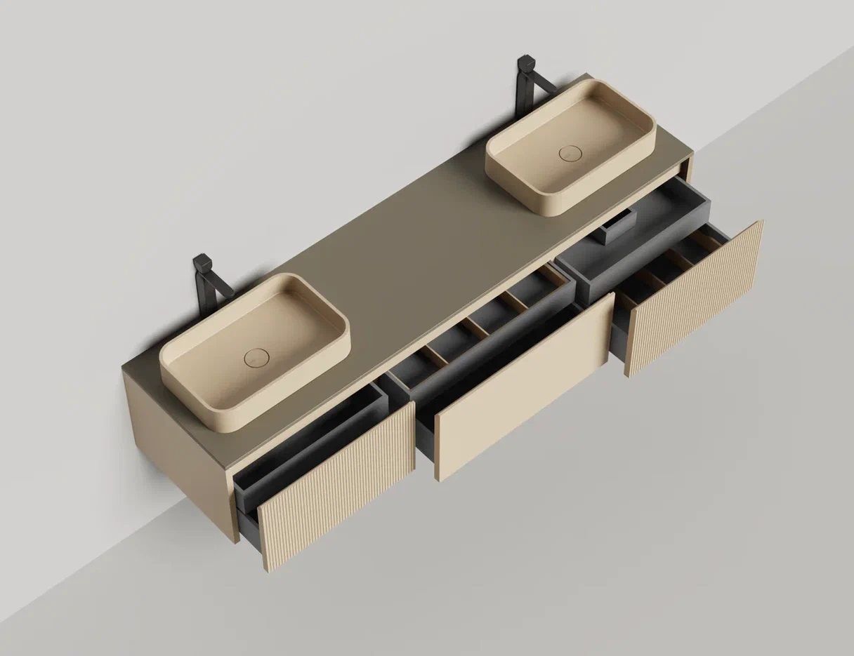 Наполнение для тумбы включает: блоки ячеек для тумб, коврики и комплект внутренней подсветки, которые помогут организовать пространство и создать более удобный доступ к вещам.Тумба DOMINO, дополненная столешницей COSTA из каменного литья S-Stone, гарантирует практичность и простоту ухода.