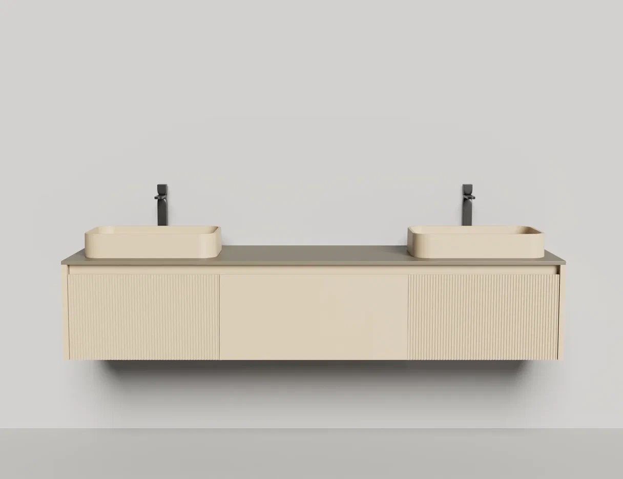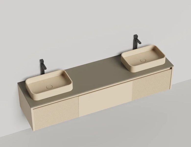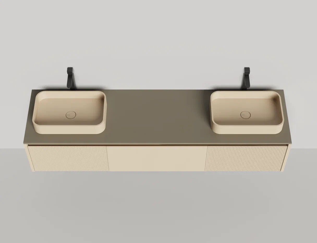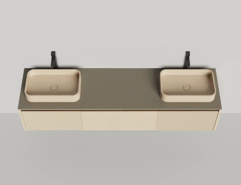 • Тумба и столешница из материала S-Stone в сборе (накладные раковины укомплектованы донным клапаном и поставляются в отдельной коробке)