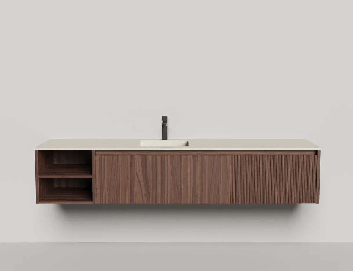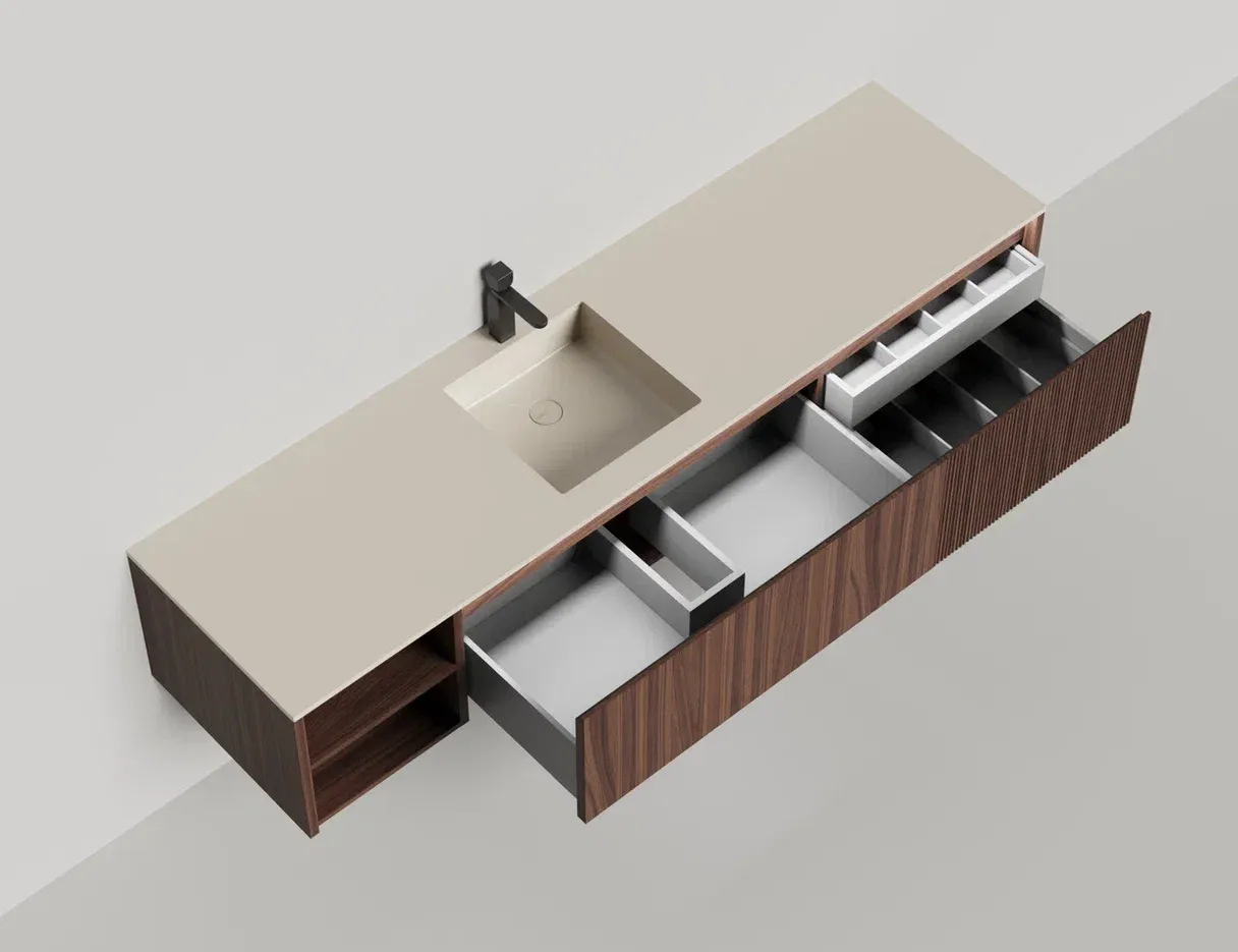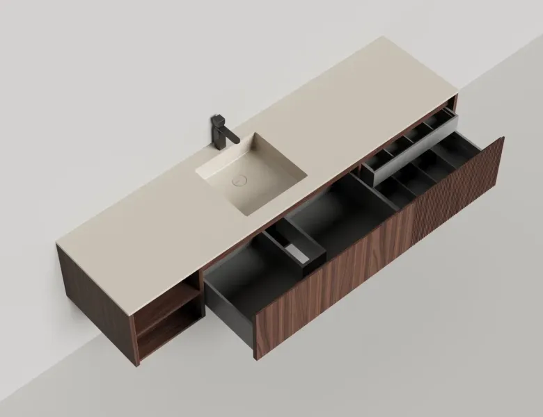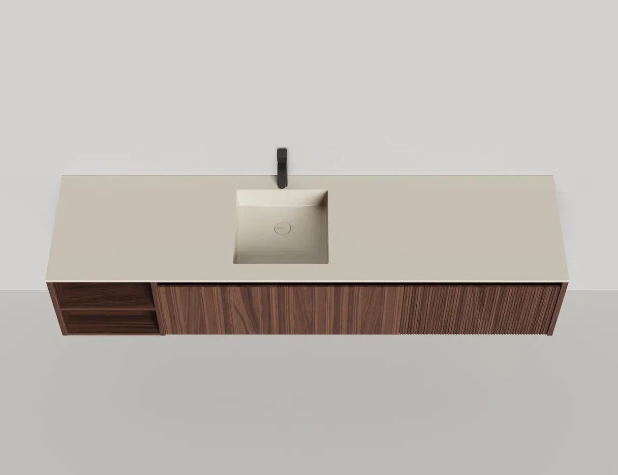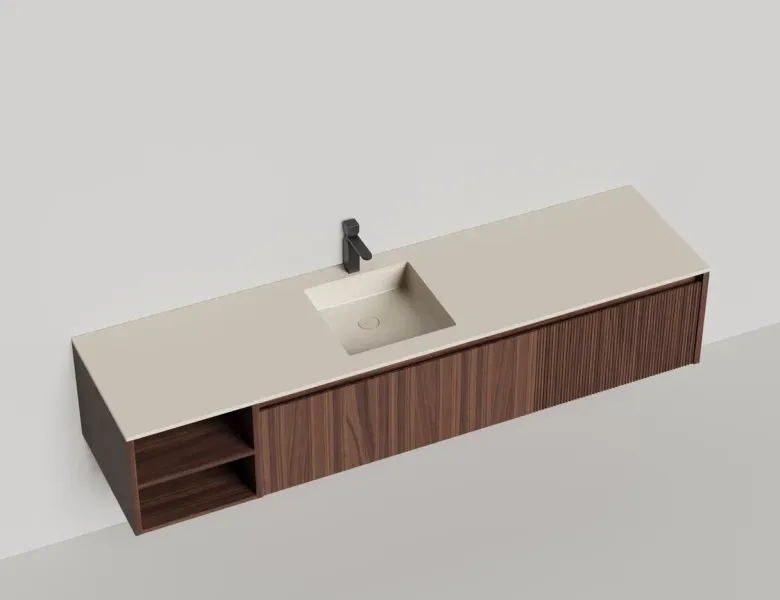 Наполнение для тумбы включает: блоки ячеек для тумб, коврики и комплект внутренней подсветки, которые помогут организовать пространство и создать более удобный доступ к вещам.Тумба DOMINO, дополненная столешницей COSTA из каменного литья S-Stone, гарантирует практичность и простоту ухода.