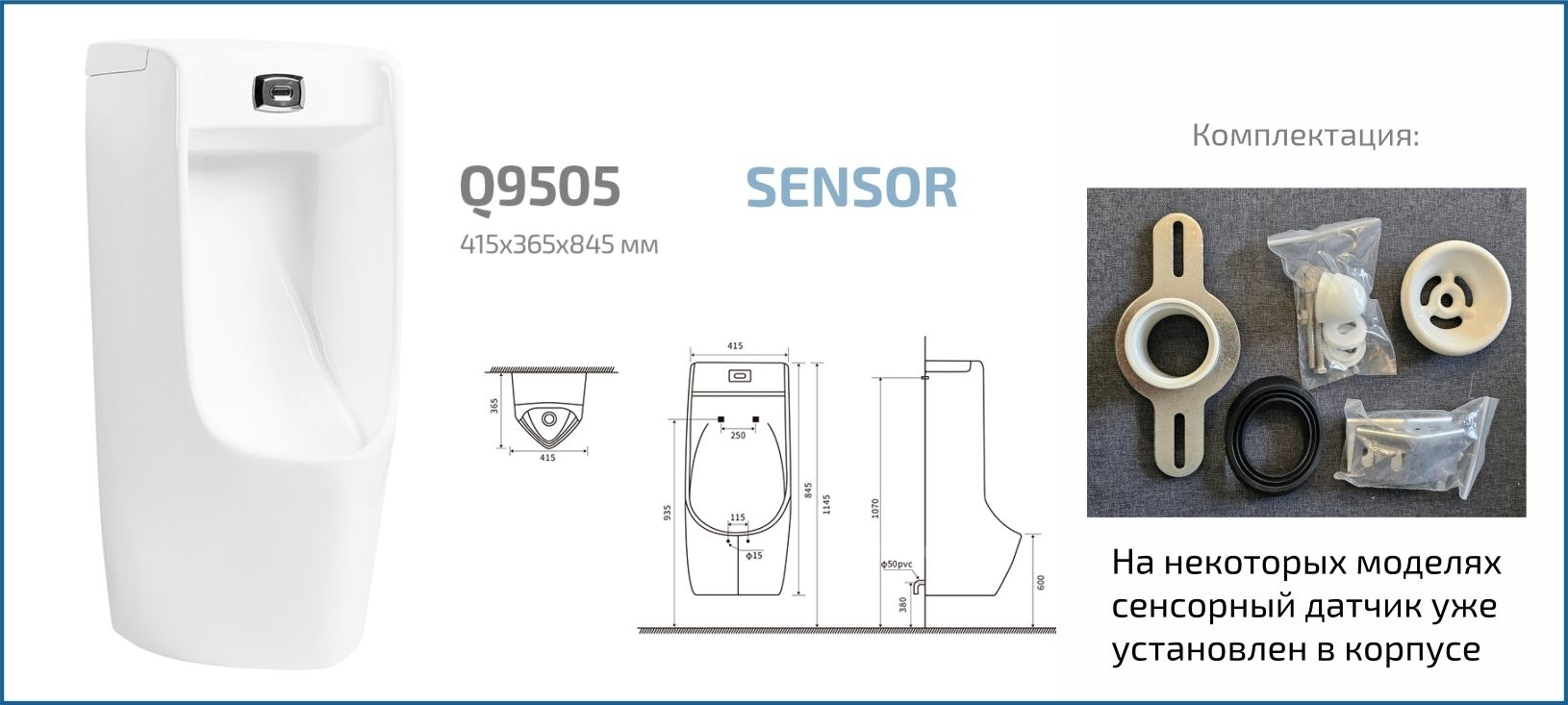 Publico — коллекция писсуаров, выполненная в строгом и лаконичном дизайне. Испанское качество и европейские стандарты соответствуют самым высоким требованиям эксплуатации. Подвесной сенсорный писсуар GiD Q9505 изготовлен из высококачественной керамики с белоснежным глянцевым покрытием, что придает ему современный и элегантный вид. Благодаря бесконтактному управлению устройство обеспечивает гигиеничность и удобство использования, автоматически активируя смыв при обнаружении пользователя. Скрытый подвод воды и настенный монтаж позволяют экономить пространство и облегчают уборку, делая эту модель идеальной для современных ванных комнат и общественных туалетов.