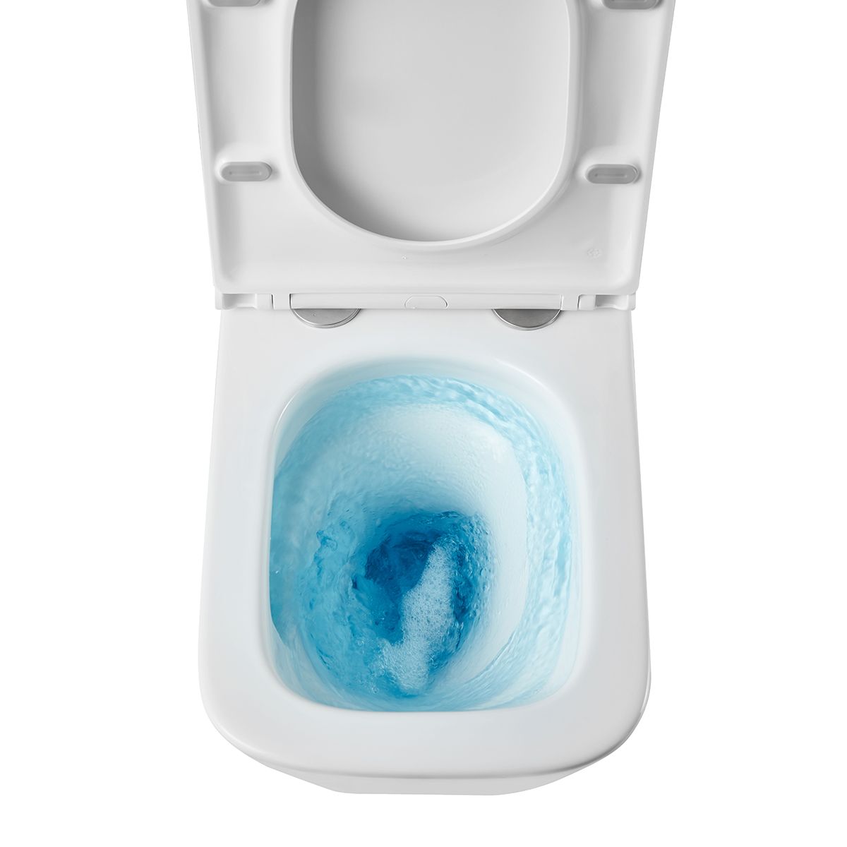 - Безободковая чаша облегчает уход, предотвращает скопление бактерий и загрязнений, которые обычно накапливаются в труднодоступных местах традиционной ободковой чаши