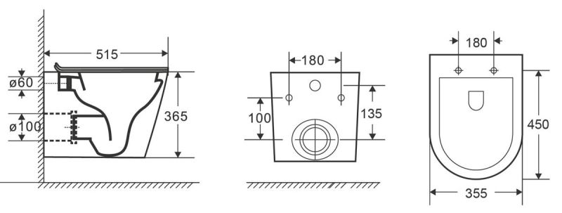 • Прилегание унитаза к стене: