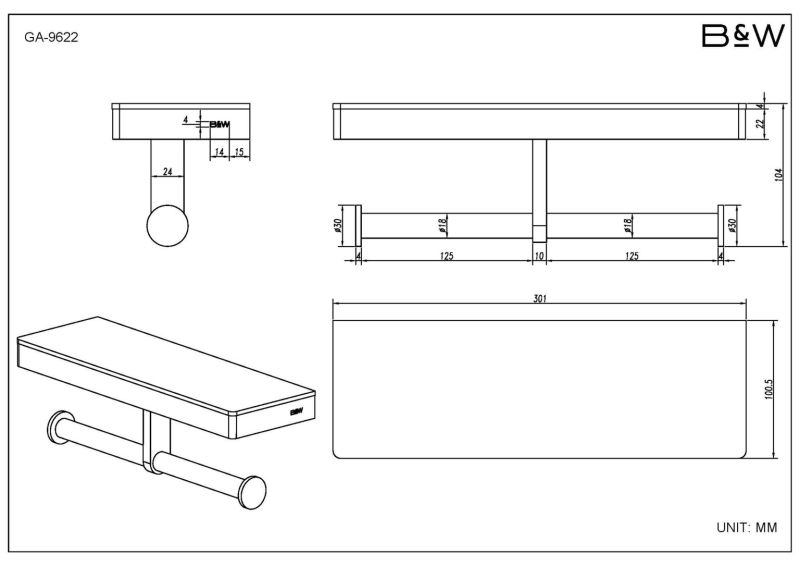 Полка и держатель для туалетной бумаги Black and White Gravity 9622GM Темно-серыйКоллекция выполнена в двух цветовых решениях CHROME и GUN METAL. Благодаря использованию закаленного стекла, каждая деталь аксессуара приобретает свое уникальное отражение. В цветовом решении GUN METAL используется черное стекло. Для удобства пользования, на концах держателя для туалетной бумаги использованы стопоры, которые не позволяют рулоны слетать при использовании. Коллекция выполнена из надежных материалов: латунь и закаленное стекло, именно это позволяет не беспокоиться о надежности и увеличенном сроке службы каждого изделия.