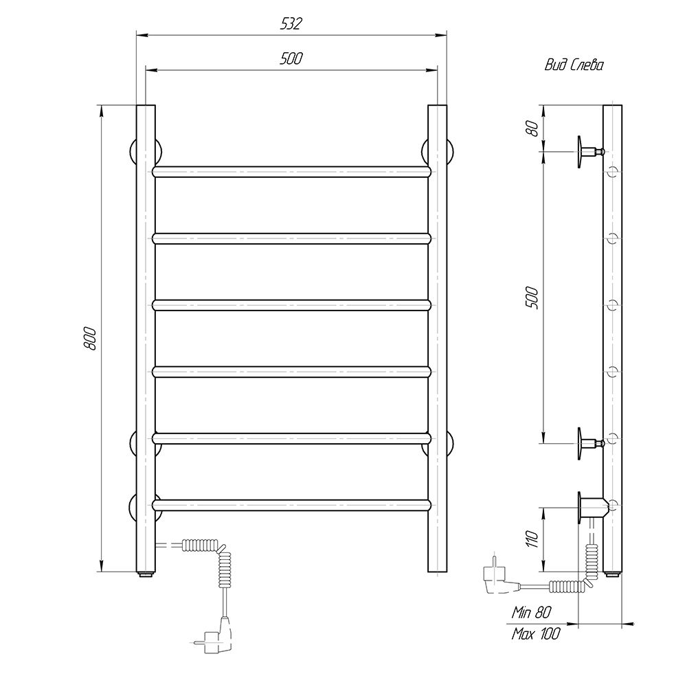 М/о расстояние (межосевое расстояние): 500Количество перекладин: 6Коллекция: КлассикТип: электрическиеЦвет: черныйМощность, Вт: 72Ширина (мм): 500Высота (мм): 800Глубина (мм): 80-100Вес: 4,86Объем: 0,07425Тэн/подключение: слеваСтрана: РоссияГарантия: 2 года