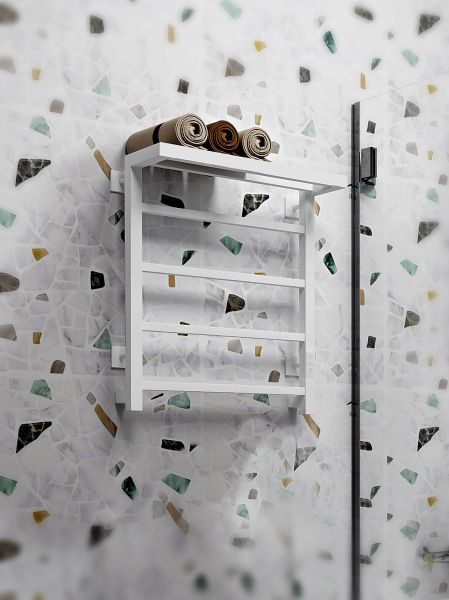 Компактный, красивый полотенцесушитель с терморегулятором в цвет. Полотенцесушитель белый дополнен полкой и в этом его преимущество, так как это дополнительное место для сушки полотенец, помогает организовать пространство в ванной комнате.